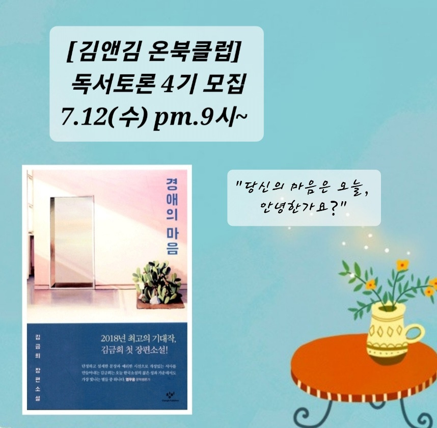 [김앤김 온북클럽] 독서토론 4기에 함께 하실 분들을 모집합니다. 4기는 김금희 장편소설 <경애의 마음>으로 7월 12일(수) 저녁 9시에 진행합니다. 이 책은 2017년 봄부터 겨울까지 계간 <창작과 비평>에 연재하며 문단의 호평과 독자의 기대를 받았는데요. 출간 전 실시한 사전서평단의 압도적인 지지와 뜨거운 반응을 불러일으켰으며, 2030 독자들의 극찬을 받았던 소설입니다.