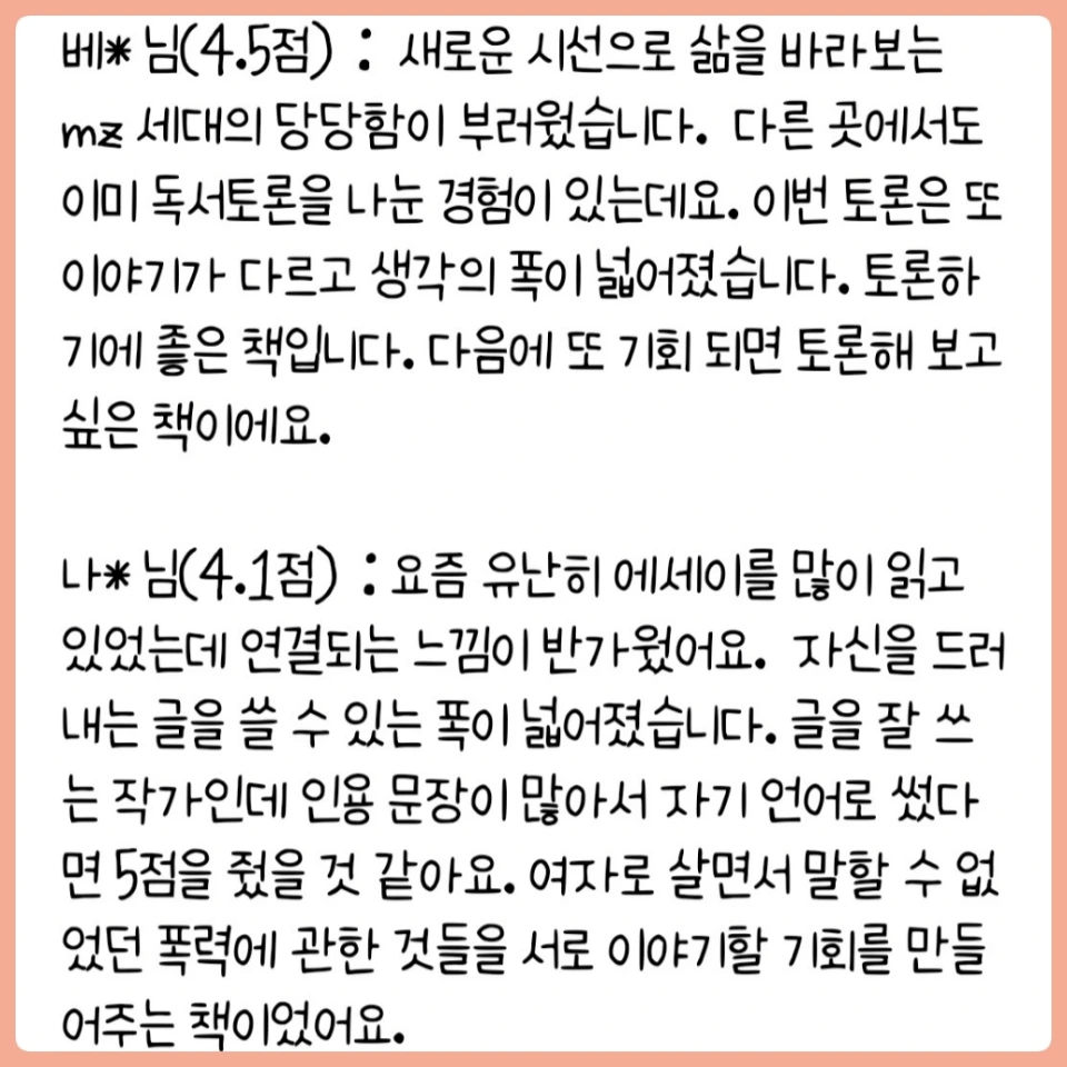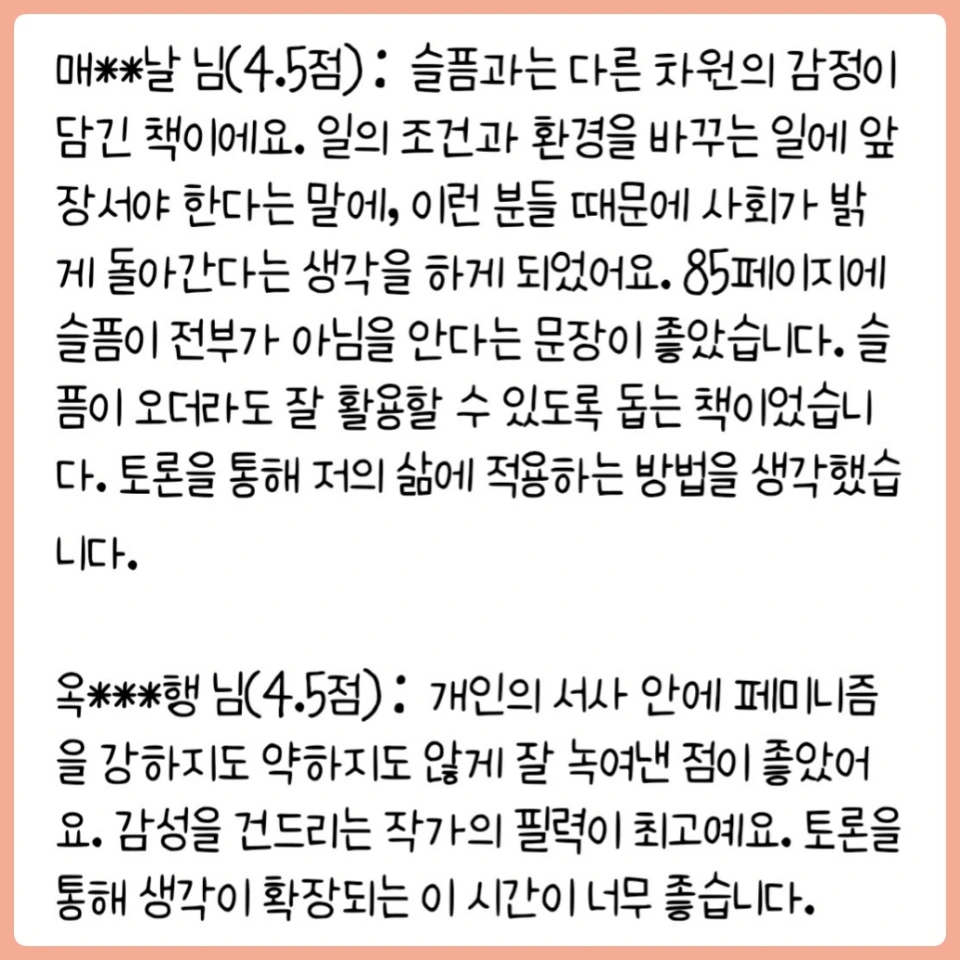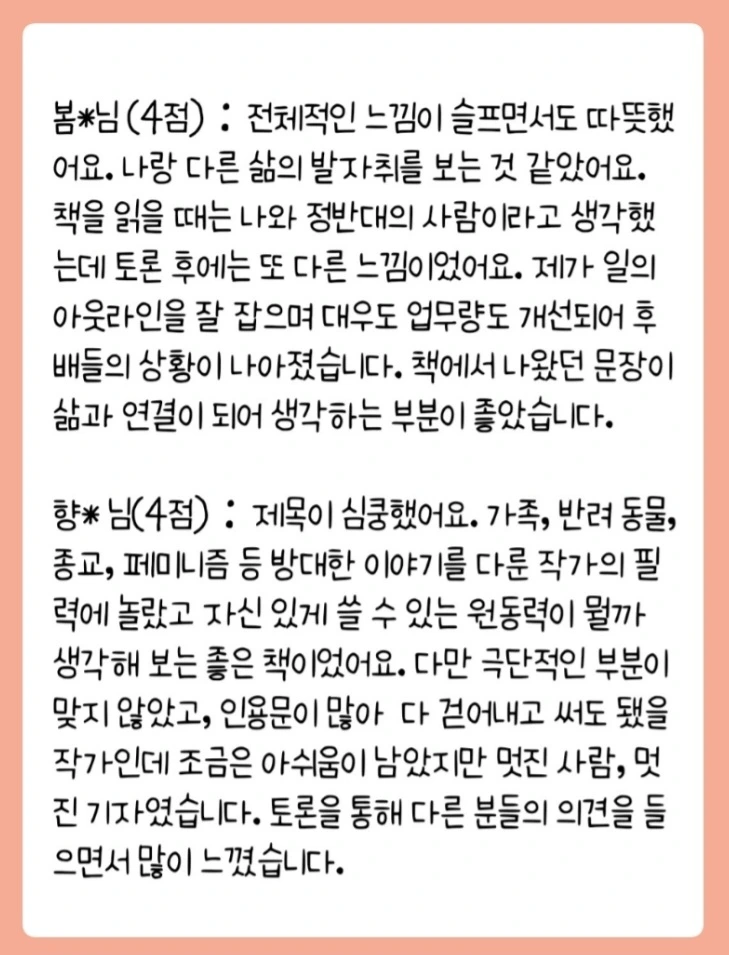 참여자들의 높은 별점을 받았는데요. 그 이유로 '제목부터 심쿵했어요, 슬픔과는 다른 차원의 감정을 담아낸 책이에요, 요즘 읽는 책들과 연결되어 좋았어요, 슬프면서도 따뜻한 느낌이 나랑 다르게 산 사람의 발자취를 보는 것 같았어요' 등의 다양한 대답을 들었습니다.