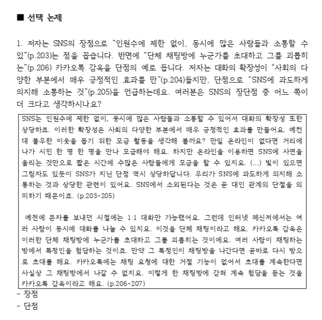 SNS는 인원수에 제한 없이, 동시에 많은 사람들과 소통할 수 있어서 대화의 확장성 또한 상당하죠. 이러한 확장성은 사회의 다양한 부분에서 매우 긍정적인 효과를 만들어요. 예컨대 불우한 이웃을 돕기 위한 모금 활동을 생각해 볼까요? 만일 온라인이 없다면 거리에 나가 시민 한 명 한 명을 만나 모금해야 해요.(...) 빛이 있으면 그림자도 있듯이 SNS가 지닌 단점 역시 상당하답니다. 우리가 SNS에 과도하게 의지해 소통하는 것과 상당한 관련이 있어요. SNS에서 소외된다는 것은 곧 대인 관계의 단절을 의미하기 때문이죠.(p.203-205)
