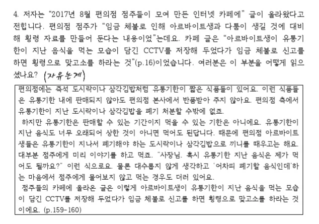 점주들의 카페에 올라온 글은 이렇게 아르바이트생이 유통기한이 지난 음식을 먹는 모습이 담긴 CCTV를 저장해 두었다가 임금 체불로 신고를 하면 횡령으로 맞고소를 하라는 것이에요." (p.159-160)