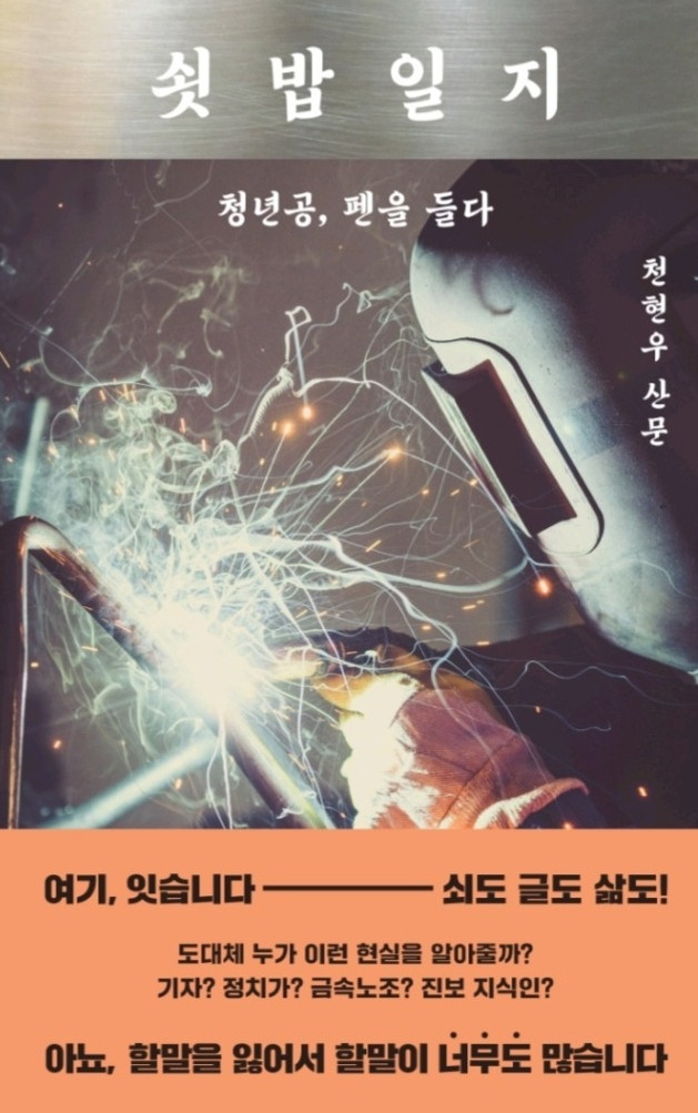 지방, 청년, 그리고 용접 노동자. 여태껏 우리가 아는 척해왔거나 모르는 척해온 세계로부터 도저히 눈을 뗄 수 없는 강렬한 작가가 도착했다. 정상 사회의 바깥, 차라리 무법지대에 가까운 인간소외의 장, 21세기 대한민국에서 일어난 일이라 믿어지지 않는 노동의 현장에서 탄생한 작가 천현우. 그는 우리 사회의 사각에서, 사양하는 산업과 도시의 틈바구니에서 용접공으로 일하며 『주간경향』에 ‘쇳밥일지’와 ‘쇳밥이웃’을 연재하며 주목받기 시작했다. 그의 첫 책 『쇳밥일지』는 연재분에 전사를 더하고 이를 전면 개고하여 한 권으로 묶은 것이다.