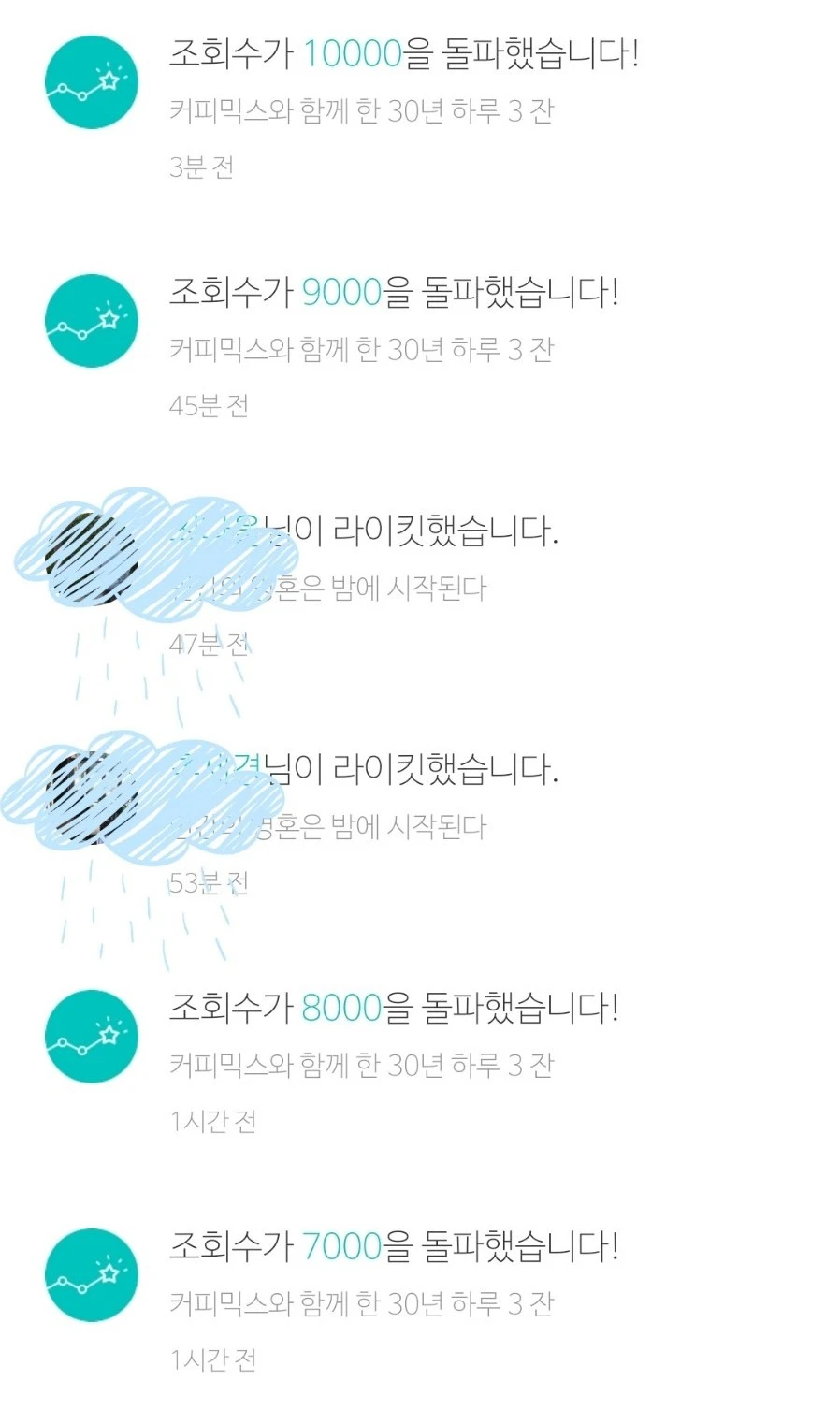 오후 2시 이후에 브런치에서 '조회수가 1000명을 돌파했습니다'라는 알람이 오더니 2000명, 3000명, 4000명, 5000명.... 11시 44분에 조회수 1만명을 돌파했다. 오늘은 밤 12시까지 19000명, 이틀째 3만명에 임박했다. 마냥 신기하고 감사하다.