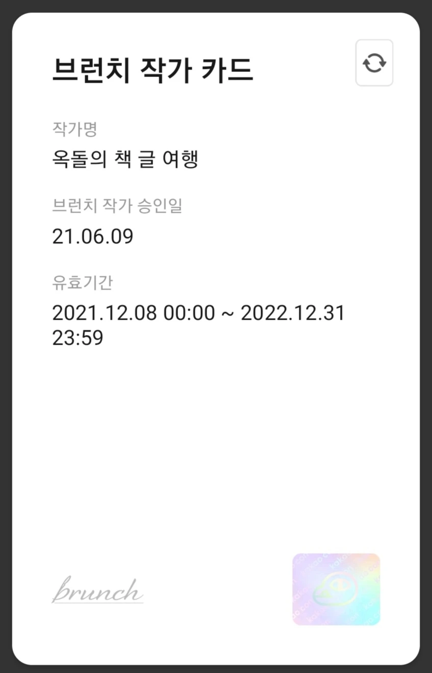 타이밍 절묘하게 브런치팀에서 작가 카드를 보내주었다. 옥돌의 책 글 여행 브런치 작가 카드. 음, 좀 있어 보인다. SNS 브런치 작가. 내 영혼이 오롯이 앉을 수 있는 곳, 이곳에서 나만의 세계를 만난다.