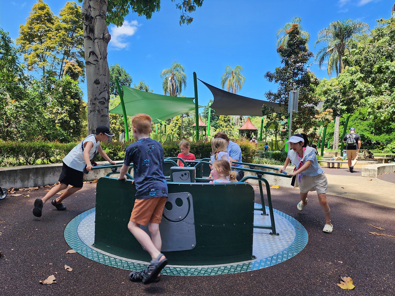 쓰레기새와 좋은 추억을 쌓은 ‘시티 보타닉가든’에도 어마어마한 규모의 놀이터가 있다. 새로운 것보다 익숙한 걸 좋아하는 신남매는 이 큰 규모의 놀이터에서 한가지 놀이기구만 주구장창 팠다. 바로, 한국에서 일명 ‘뺑뺑이’라 불리는 그것! 처음엔 호주 친구들의 눈치를 보며 뺑뺑이 의자에 살포시 앉아있던 신남매는 이 ‘뺑뺑이’에 손님을 태우기 시작했다. 아이들이 오면 “탈거니?” 물어보고, 아이들이 안전하게 앉으면 “출발~ ”이라고 얘기를 하며 뺑뺑 돌려준다. 다른 친구가 함께 미는 경우, 어린 손님을 태우면 "천천히 하자"라고 얘기해서 맞춰서 돌린다. 이날 다녀간 손님들만 못해도 50명은 넘는 것 같다. 부모들은 자식들 데리러 와서 신남매에게 "땡큐”하고 갔다. 전날 서커스 수업 후유증으로 종우는 어깨, 연서는 팔뚝에 파스를 붙였는데 신남매는 이날 파스 투혼을 했다.