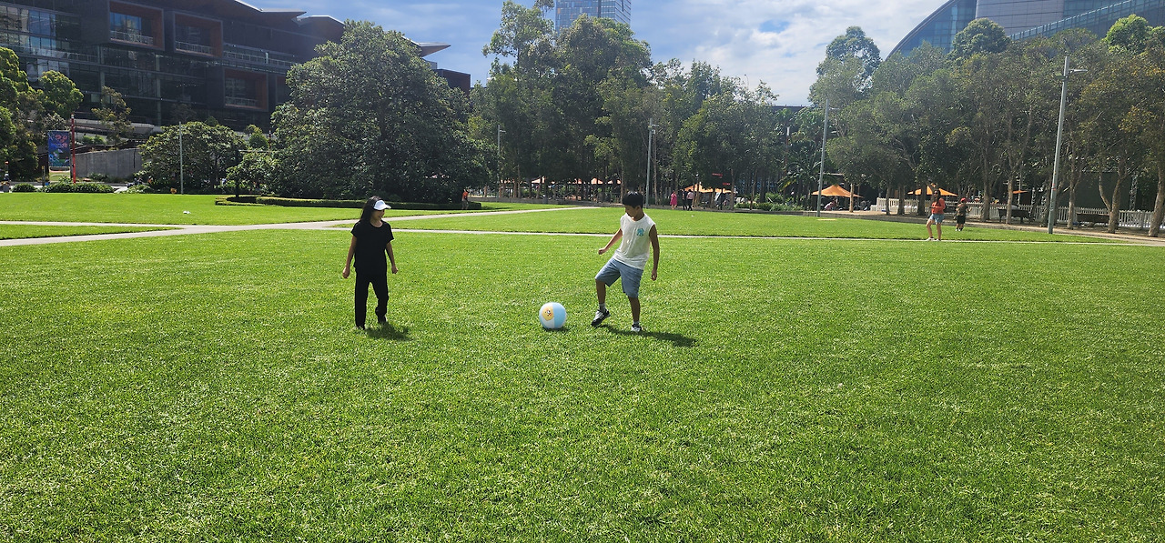 우리나라 잔디밭은 ‘들어가지 마시오’ 푯말이 있다. 그 푯말을 볼때마다 '이 잔디밭은 누굴위한 잔디밭인가?' 생각했다. 호주는 잔디밭에 엄격한 나라지만 우리나라처럼 사람에게 엄격하진 않다. 사람이든 애완견이든 자유롭게 이용한다. 어딜가든 푸르게 관리가 잘 되어 있는 걸 보고 '얼마나 부지런하면 이렇게 잘 관리할 수 있는 걸까?' 생각했다. 그런데 부지런할 수밖에 없는 이유가 잔디밭을 관리하지 않으면 벌금을 내야 한단다. 호주인들이 부지런하게 관리해준 덕분에 신남매는 이 잔디밭을 마음껏 즐길 수 있었다. 한국에서 가져온 물건 중에 가장 요긴하게 썼던 물건은 비치볼이었다. 비치볼은 입으로 후후 불어도 금방 불 수 있어서 물놀이할 때와 잔디밭에서 놀 때 유용했다. 우리는 항상 바람을 쭉 빼서 가방에 쏙 넣어 다녔는데, 목적지가 따로 있어도 가는 길에 잔디밭이 있으면 당!연!하!게! 잔디밭으로 들어가 공놀이를 실컷하다 갔다. 유명 관광지를 가지 않아도, 아이들은 초록색으로 덮인 곳에서 마음껏 뛰어 놀았다.