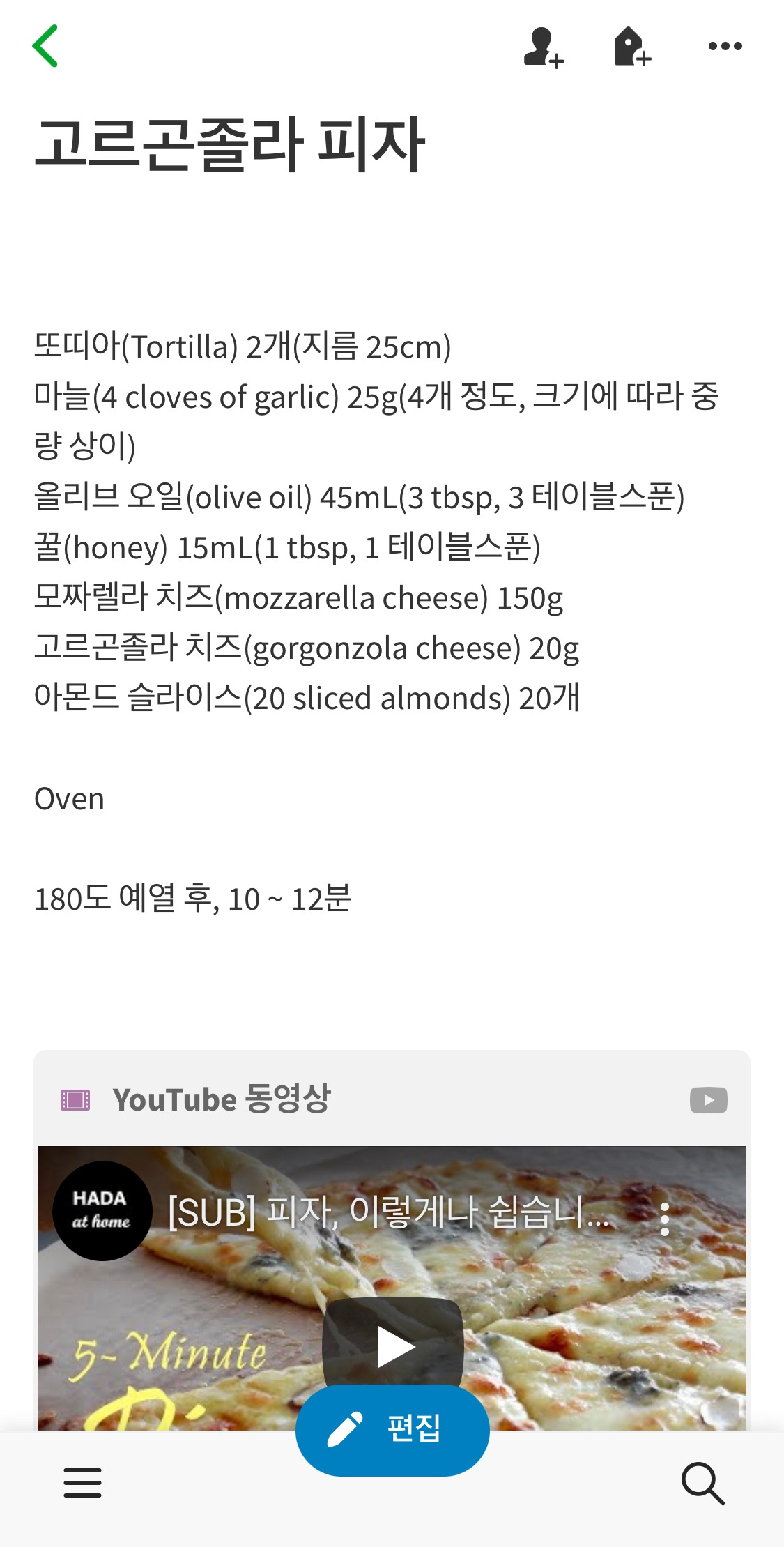 구독하는 요리/베이킹 유튜브나 블로그에서 습득하는 레시피를 저장하는 용도이다. 레시피 내용은 스크랩하고 추후 보기 좋게 정리하고 해당 게시물의 링크를 아래 달아두어 혹시 설명이 부족한 경우 원 글/영상을 보며 만들기도 한다. 폴더(요리/베이킹/반찬 등)와 태그(한식/양식/일식 등)로 분류하고 있다.