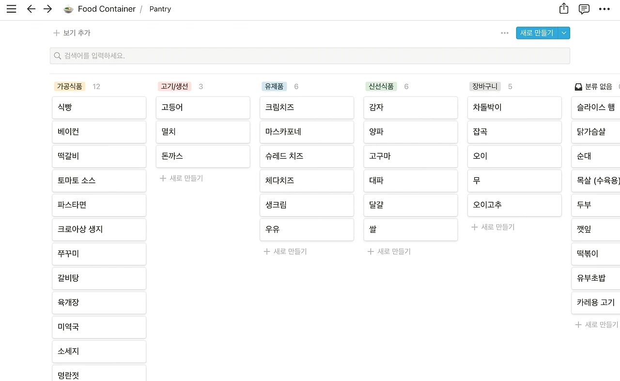 노션은 컬처 로그나 여행 계획 수립, 이력서 및 포트폴리오 등 다양한 용도로 사용하고 있지만 살림에 활용할 수도 있다. 칸반 보드를 활용해 집에 있는 식재료를 관리하는 것이다. 분류는 고기/생선, 유제품, 채소, 가공식품 등으로 되어 있으며 보관 온도에 따른 태그를 달아두었다. 칸반 보드의 설정을 변경하여 식재료를 분류별로 구분하는 대신 냉장/냉동/실온으로 구분하는 것도 가능하다. 집에 있는 식재료를 한눈에 파악하고 만들 수 있는 음식을 가늠하거나 특정 음식을 만들 때 부족한 재료도 확인할 수 있다. 유통기한이 2~3주 되는 제품의 경우 자칫하면 뜯지도 못하고 버리는 상황이 발생할 수도 있는데, 날짜로 지정된 속성을 활용하여 리마인더 설정을 해두면 유통기한 전에 잊지 않고 소비할 수 있다. 구입해야 할 식재료를 따로 정리해두면 다음번에 장보기 시 분류해둔 식재료를 구매하면 된다.