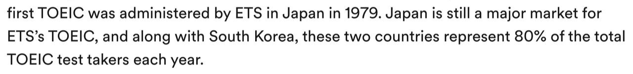 ETS 측에서 글로벌 토익 응시 인원수를 정확히 추산한 최신 자료는 공개하지 않은 상태이다. 다만, 매년 6-700만 명이 응시한다는 것을 해외 기사들을 통해 확인할 수 있었다. 공식적으로 공개된 자료로 확인해 보았을 때, 16년도 일본의 토익 응시자 수는 약 250만 명이고 13년도 한국의 토익 응시자 수는 약 200만 명이다. 최신 데이터가 아니라 확언하기는 어렵지만 대략 450-500만 명의 잠재 고객이 있고 그중 복수 응시자, 즉 허수를 제거하면 그 수가 더 줄어들 것으로 전망한다.