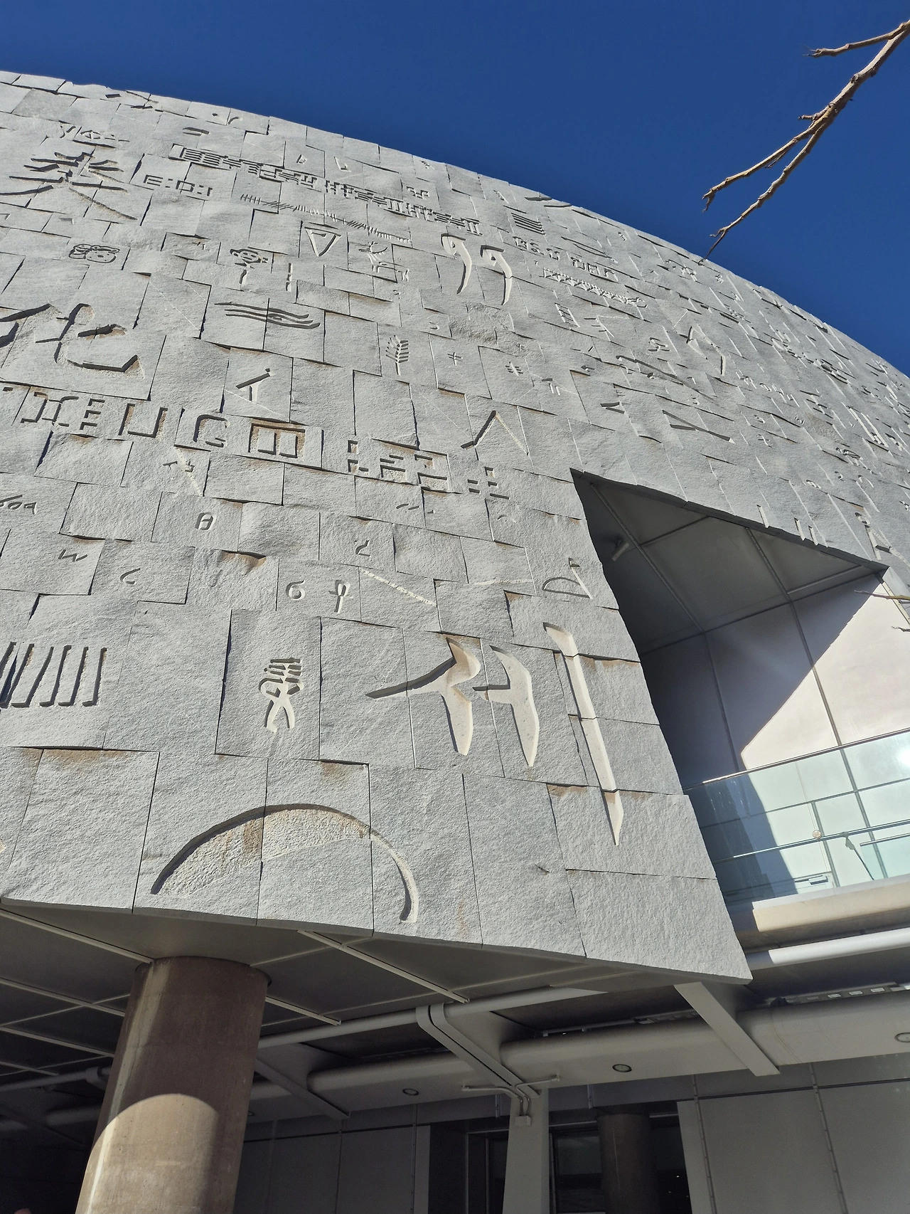 고대상형문자에서부터 설형문자, 갑골문자 음악기보법, 컴퓨터와 유전자코드, 바코드까지 모든 문자가 새겨져 있다,