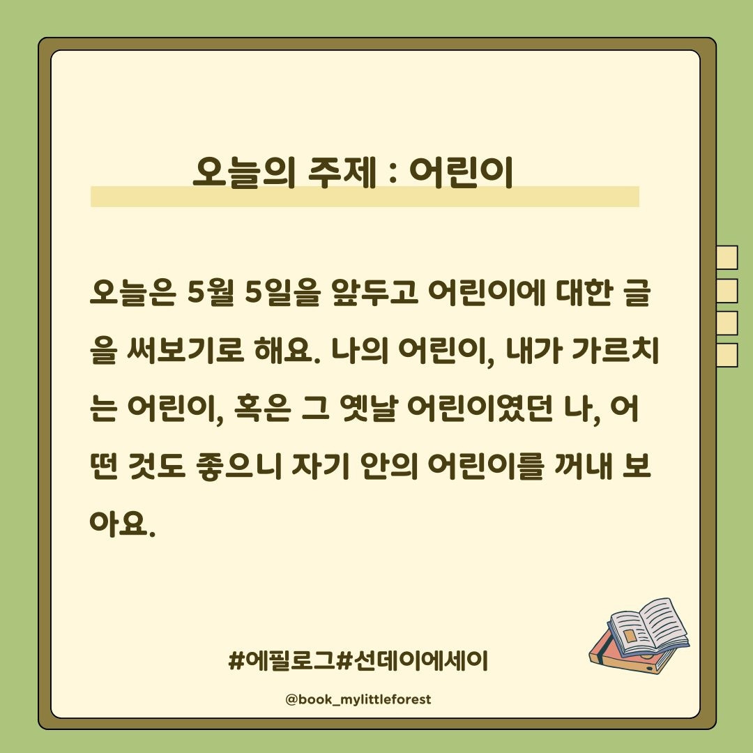 이번 주 선데이 에세이 주제는 '어린이'였습니다. 개인적으로 힘든 시련이 있었던 고난의 주간이 끝나고 난 뒤 다른 때보다 생각이 더 많아진 것인지, 아니면 아무런 생각이 안 나는 것인지 바로 글을 쓰지 못하고 한참 생각에 잠겨 있었습니다. 최근에 미성숙한 '내면 아이'를 만났기에 이 주제가 더 어렵고 두려웠던 것 같습니다. 왜 나조차 어린이를 '성숙하지 못한 존재'로 바라보는지 그 실마리를 찾아 글쓰기 여정을 떠나봅니다.