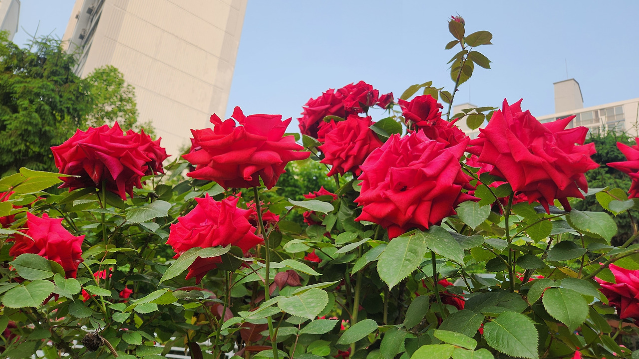 봄이 되면 찾아오는 꽃들이 다 지고 아쉬울 즈음 자연은 또 장미꽃을 내어 놓는다. 출근 준비로 눈코 뜰 새 없이 바쁜 아침 아들과 딸을 태우러 주차장에 나갔다가 화단에 피어있는 장미꽃을 차마 지나칠 수 없었다. 마침 조금 일찍 나간 날이라 차에서 내렸다. 그 자연이 만든 쨍한 색이 너무 예뻐서. 나를 보러 오라고 유혹하는 내음에 취해서 나는 정신줄을 놓고 그곳으로 걸어가고 있었다. 아침마다 허덕거리던 삶에서 잠시 탈출하여 장미꽃에 취했다. 어쩌면 신은 이렇게 예쁘고 강렬한 장미꽃을 만들어 놓았을까? 한 잎 한 잎 오묘하게 자리 잡아 중심을 향해가는 그 아름다운 모양과 색의 조화가 인간을 사로잡지 않는다면 무엇이 인간을 유혹할 수 있단 말인가. 빨간 장미는 초록색 잎이라는 조연이 있기에 더 돋보인다. 파란 하늘까지 배경으로 더해주니 개화의 절정을 이루는 요 며칠간 화단의 주인공이 될 만한다. 게다가 가시까지 있어 도도하기까지 하다. 이 녀석!