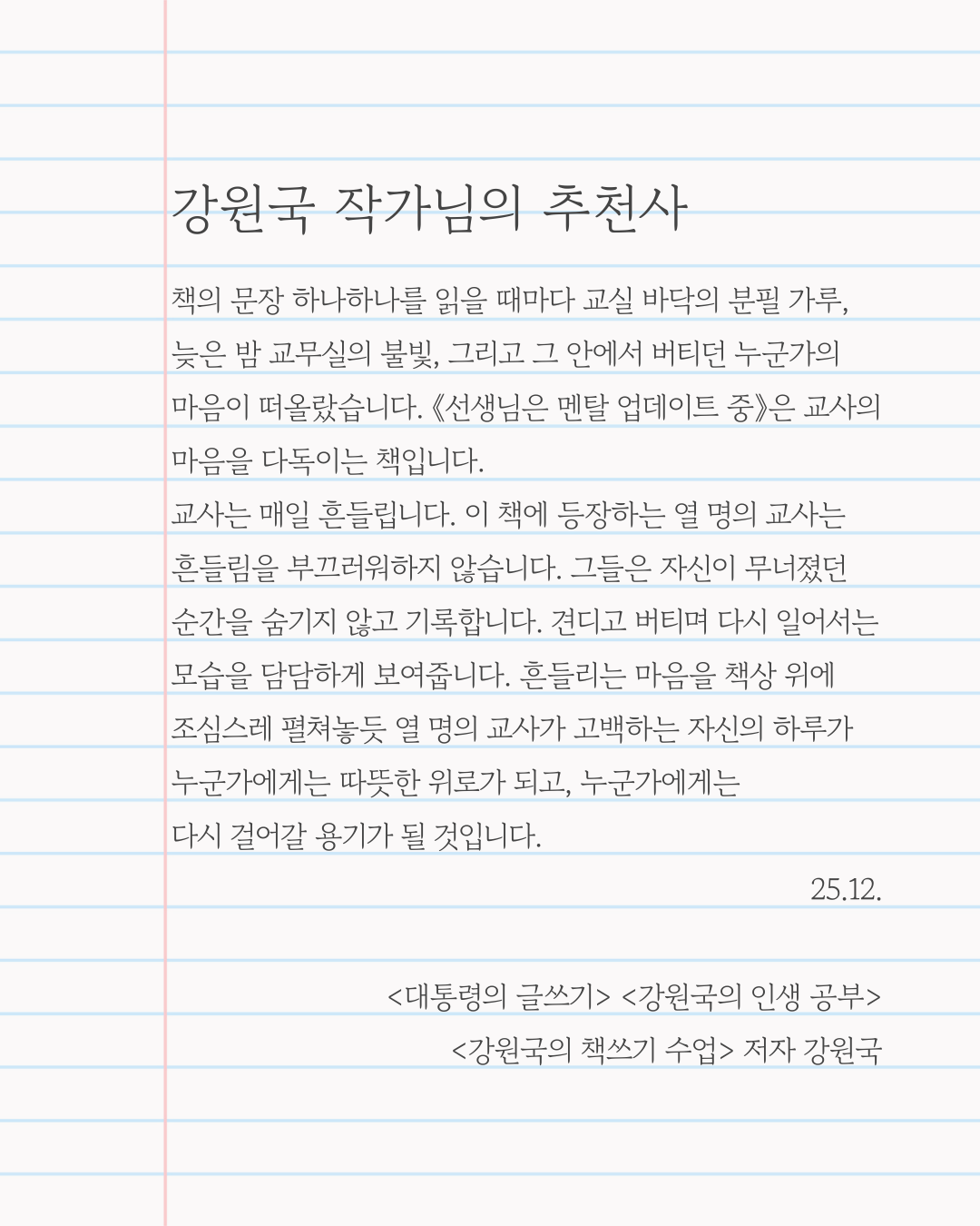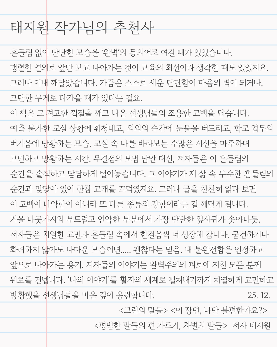 사실 이번 책은 지난해 교사성장학교 책 쓰기 콘서트를 통해 만난 선생님들과 진행한 작업들이 빛을 보게 된 것입니다. 초고는 작년 11월에 마감을 했지만 적절한 출판사를 만나지 못한 채 한 해를 넘기게 되었습니다. 그만큼 저에게는 잊힌 꿈과 같았지요. 그러다가 올해 미다스북스 출판사와 계약을 하게 된 것입니다. 우연히 첫 번째 책과 같은 출판사에서 두 권의 에세이를 출간하게 되었습니다. 출간 시기가 비슷해지면서 두 버전의 원고를 퇴고하느라 많이 힘들었지만 출간의 기쁨은 산술적으로 표현하기가 어렵네요. 마치 첫째를 낳고 얼마 안 있어 둘째를 나은 기분이라고 할까요? 아니, 요 정도의 차이라면 쌍둥이를 낳았다고 해도 될 것 같긴 합니다. 첫 번째 책이 필사하고 글 쓰는 삶에 집중되어 있다면, 두 번째 책은 교사의 삶을 이야기합니다. 신규교사부터 경력 20여 년이 넘는 교사까지, 개성 넘치는 10인의 교사 작가들의 이야기를 담은 솔직 담백 교실 에세이입니다. 책 내용이 궁금하신 분들을 위해 강원국 작가님의 추천사와 태지원 작가님의 추천사를 들려드립니다. 추천사부터 이미 마음을 위로해 주는 책입니다.
