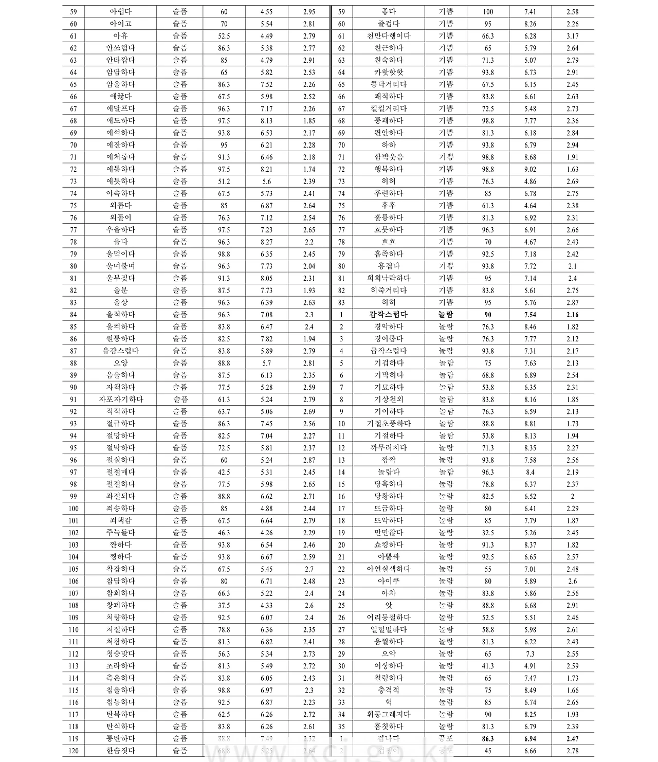 이 논문은 총 504개의 감정표현단어들로 구성된 목록을 완성하였다. 단어들의 감정 범주 분석 결과, 504개 단어 중 426개 단어는 한 범주의 감정을 의미하였는데, '슬픔'을 나타내는 단어가 가장 많았으며, 다음으로 '분노', '기쁨' 순으로 나타났습니다. 다음 72개 단어는 두 감정 범주를 나타내었는데, '분노'와 '혐오', '슬픔'과 '공포' 그리고 '기쁨'과 '홍미'로 묶이는 단어가 많았다. 세 감정 범주를 보인 6개의 단어는 '놀람', '흥미', '기쁨'의 조합이 가장 높은 빈도로 나타났다.