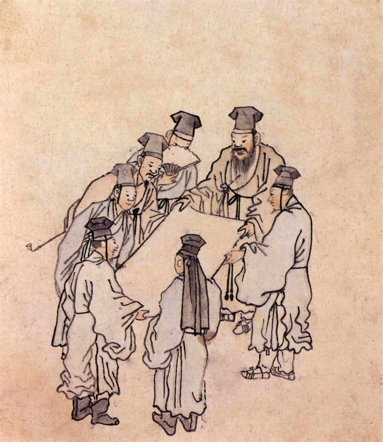 위 그림은 김홍도의 풍속화첩 그림 중 하나이다. 대부분 서민의 일상생활을 그린 그림들인 '풍속' 화첩에 '그림 감상'이라는 소재가 들어간 이유는 뭘까? 우리는 이 그림을 통해 18세기에 그림을 감상하는 풍속이 널리 퍼져있음을 알 수 있다. 그리고, 그림을 즐기는 선비들의 문화 또한 조선 후기 생활상의 한 단면임을 보여주고자 한 김홍도의 의도를 읽을 수 있다. 그림 속 등장인물은 옷차림으로 보아 유생들이고, 가운데 나이가 지긋하신 분이 그림의 주인인 듯하다. 이 그림에서 인물들이 함께 모여 그림을 감상하고 서로 의견을 나누는 듯한 모습은 하브루타에서 중요하게 여기는 대화와 토론을 통한 학습을 연상시킨다. 이들은 그림에 대한 자기 생각을 공유하고, 다른 사람의 관점을 들으며 새로운 시각을 배우고 확장하고 있는 중은 아니었을까? 함께 모여 그림을 감상하며 서로의 사고를 발전시키는 이런 아름다운 풍속은 왜 현대까지 이어지지 못한 것일까?