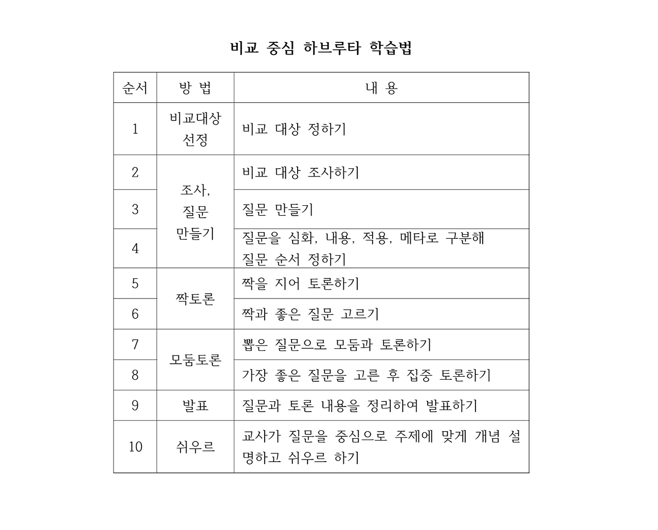 이 학습법은 텍스트에서 비교 대상을 정하는 것부터 시작된다. 비교 대상에 대해 자세하게 조사하고 질문을 만든 다음, 그 질문을 가지고 비교하는 대상에 대해 토론하는 수업이다. 비교를 통해 차이점과 유사점을 논의하면서 창의적인 사고를 하게 된다. 짝과 논의해 고른 질문으로 모둠 토론을 하고, 가장 좋은 질문을 고른 후 집중 토론을 한다. 그 뒤의 흐름은 질문 중심 학습법과 동일하다.