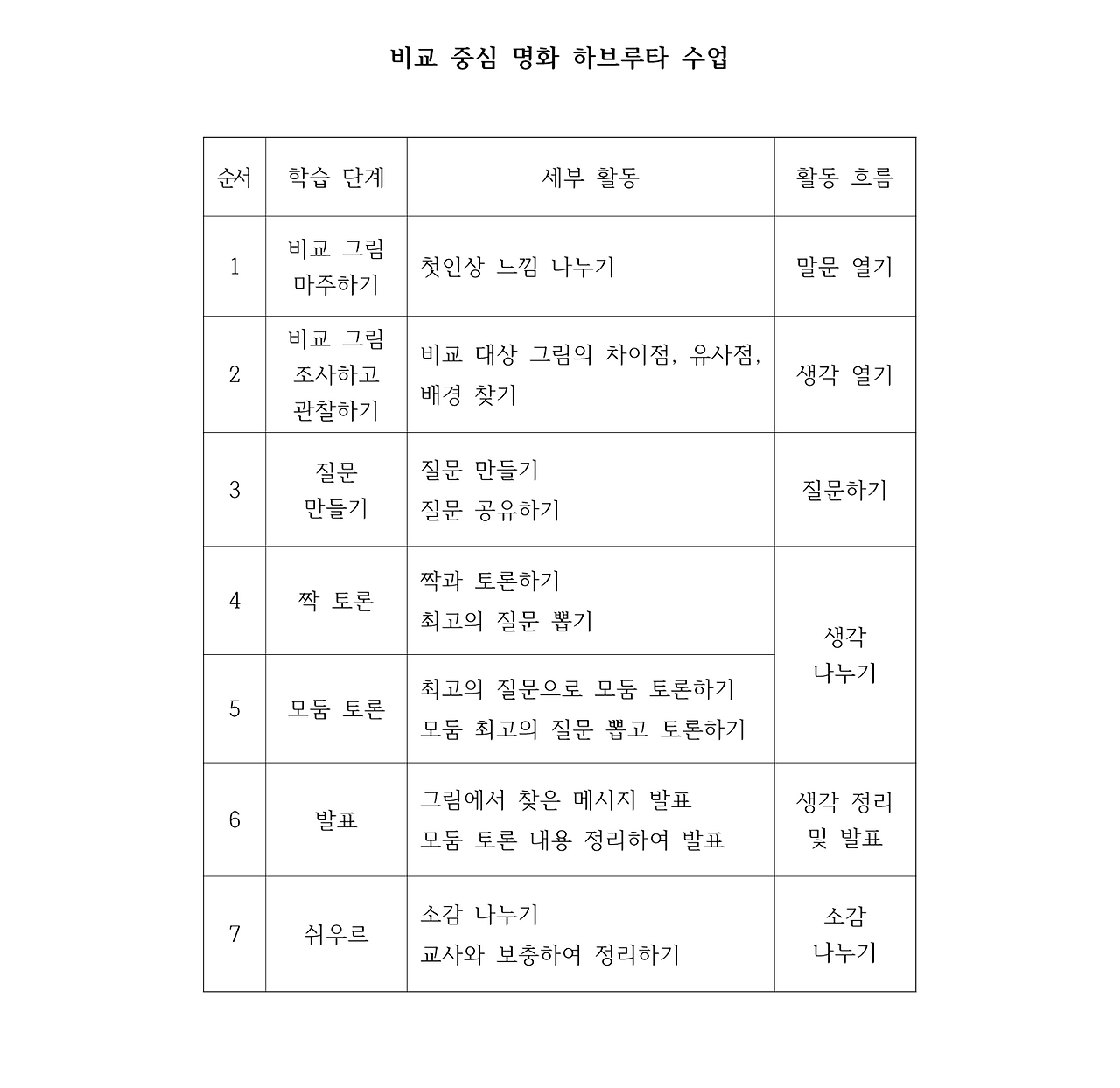 본 수업모형은 전성수의 하브루타 수업 모형 중 질문 중심, 비교 중심 하브루타 수업모형을 그림 감상 수업에 적용한 것이다.
