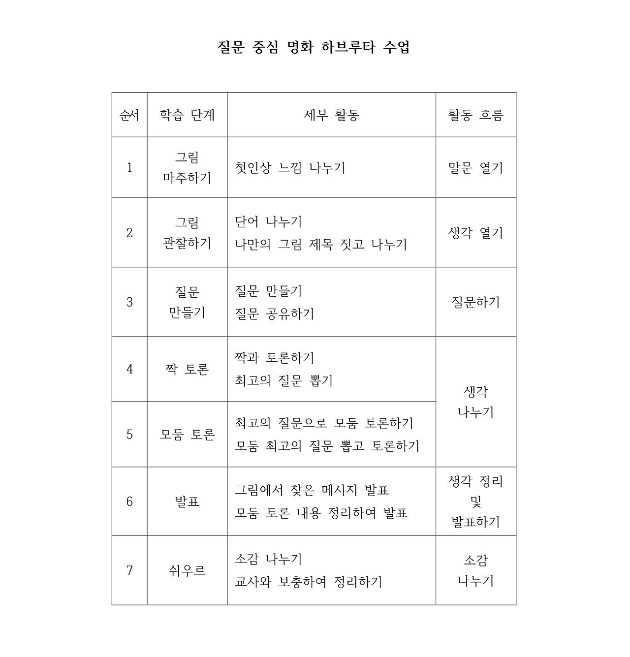 그 이후의 활동은 질문 중심 명화 하브루타 수업모형의 흐름과 동일하다.