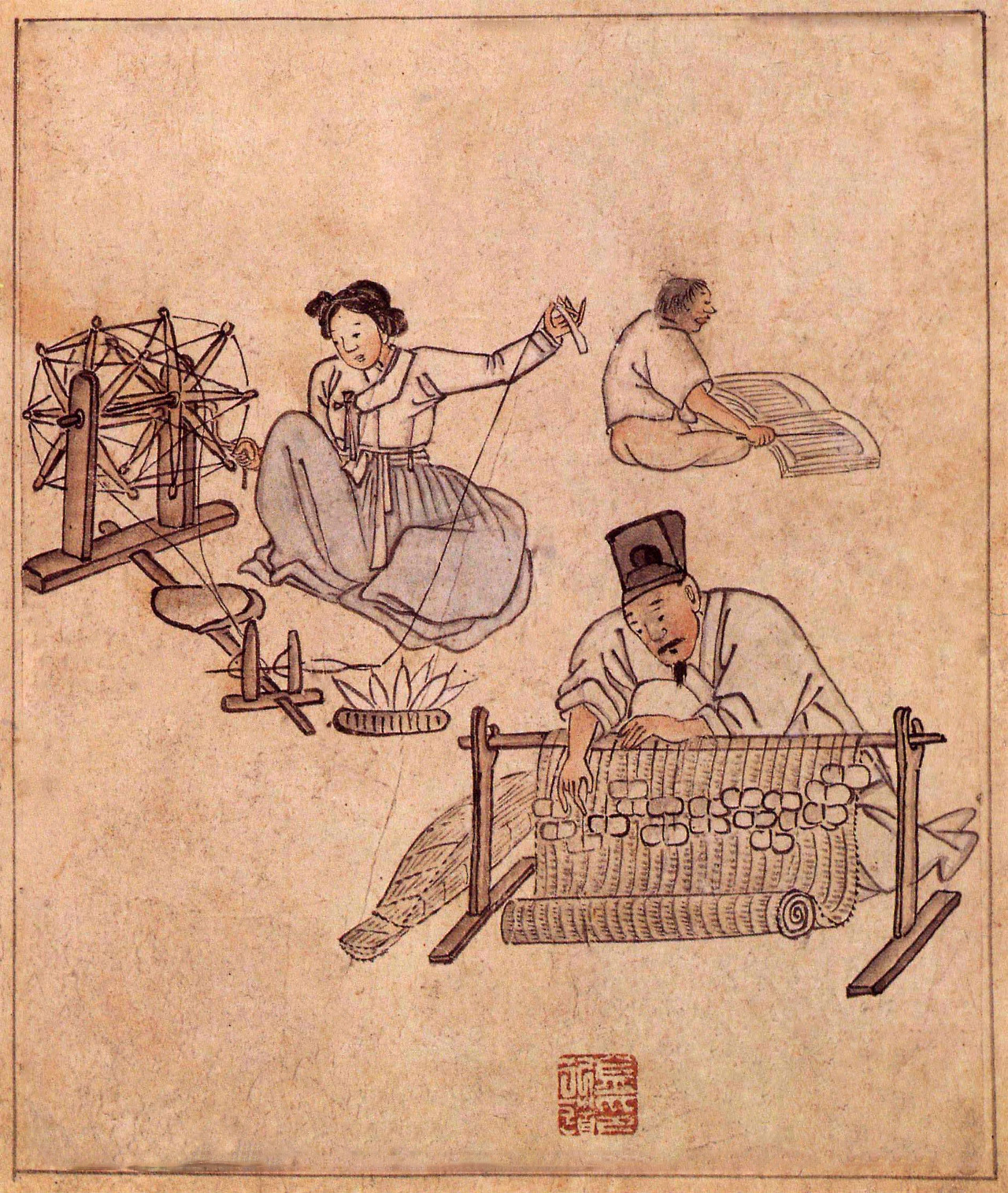 자리를 짜는 사람은 사방관을 쓰고 있다. 사방관은 양반이 아니면 쓰지 못한다. 그런데 양반이 웬일로 노동을 하고 있는가. <중략> 토지와 노비가 없으면, 자연히 양반 행세를 할 수가 없다. 한데 조선 후기로 오면서 경제적 능력을 갖추지 못한 양반이 속출하였다. 대부분의 양반은 육체적 노동을 기피하였지만, 이 그림에서 보듯 일하는 양반도 있다. 당연히 이 자리는 판매를 목적으로 하는 것이고, 자리를 짜는 데 생계가 달려 있을 것이다. <중략> 가난한 양반은 어쩔 수 없이 자리를 짜게 되었다. 하지만 양반으로서의 마지막 자존심을 지키기 위해 여전히 사방관을 쓰고 있다.