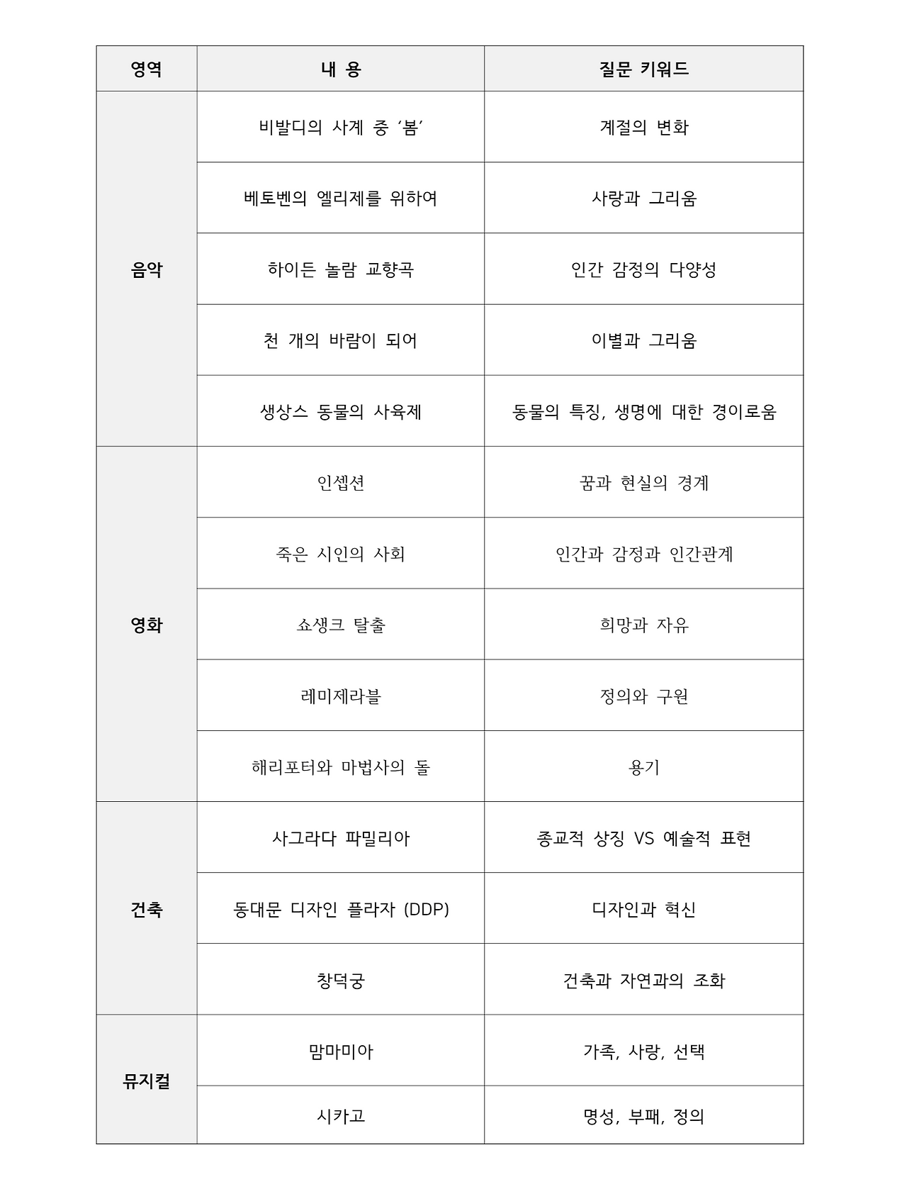 이러한 다양한 미술 영역에서 하브루타를 활용하면 여러 형식에 대한 이해를 깊이 있게 확장할 수 있으며, 창의적이고 비판적인 사고를 기를 수 있을 것이다. 영역을 더 확장하여 음악, 영화, 건축, 뮤지컬 등도 같은 형식으로 하브루타를 진행해 보자.