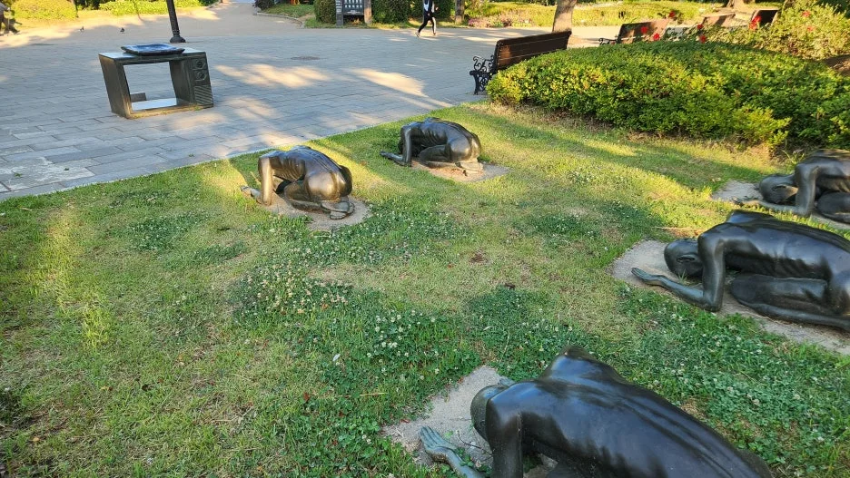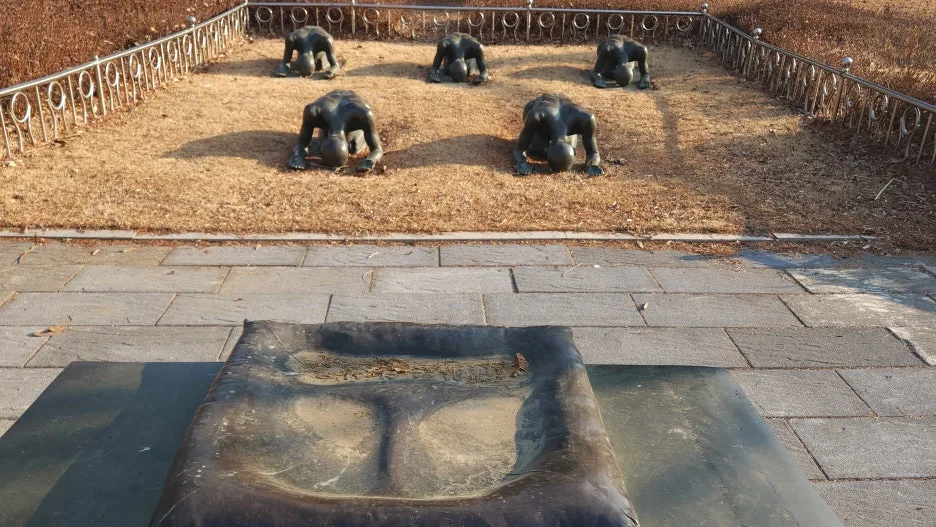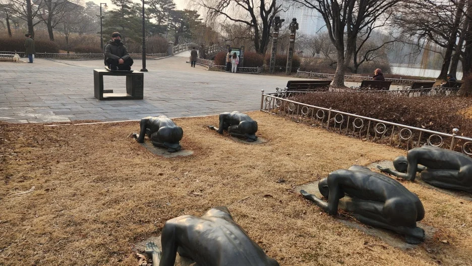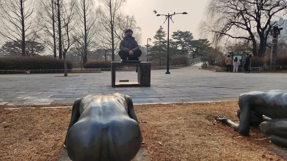 일산 호수공원 안에 있는 야외 조각 작품으로 하브루타를 함께 해보자. 작품을 직접 보며 진행하면 좋겠지만 여건상 어려우므로 필자가 겨울과 봄에 찍은 사진을 보며 이야기를 나눠보기로 하겠다. 같은 작품인데 계절에 따라 느낌이 확연히 다름을 알 수 있을 것이다. 절을 하는 다섯 명의 사람 앞에 화면 뚫린 구형 TV가 있고 그 위에 빈 방석이 놓여있다. 조각가는 방석 위에 친절하게 '앉아보십시오'라는 글자를 써두었다. 만지는 것이 가능하지 않은 작품과 달리 이 작품은 관객이 TV 위에 직접 앉아서 감상할 수 있도록 한 참여형 작품이다.