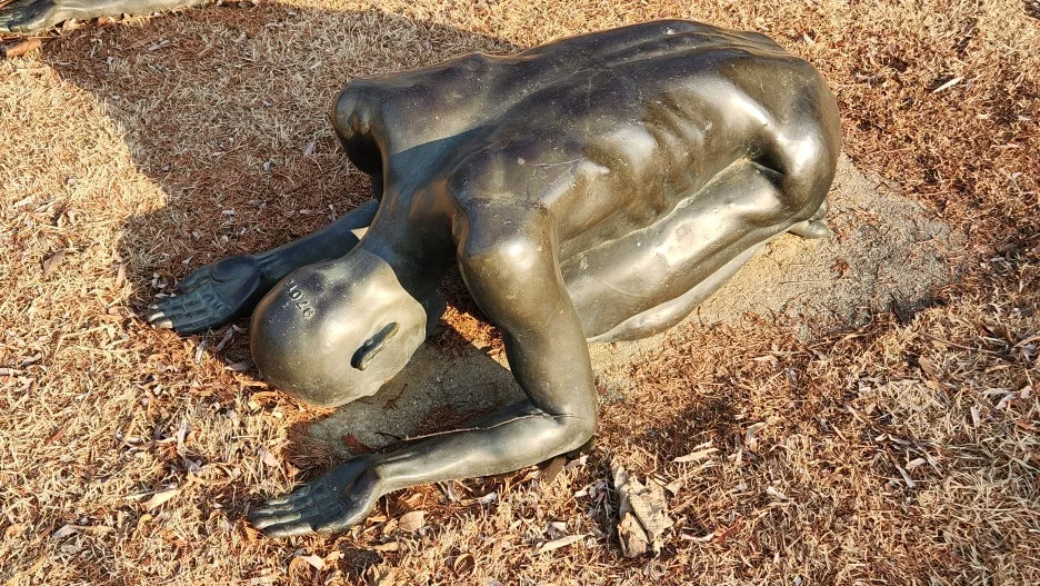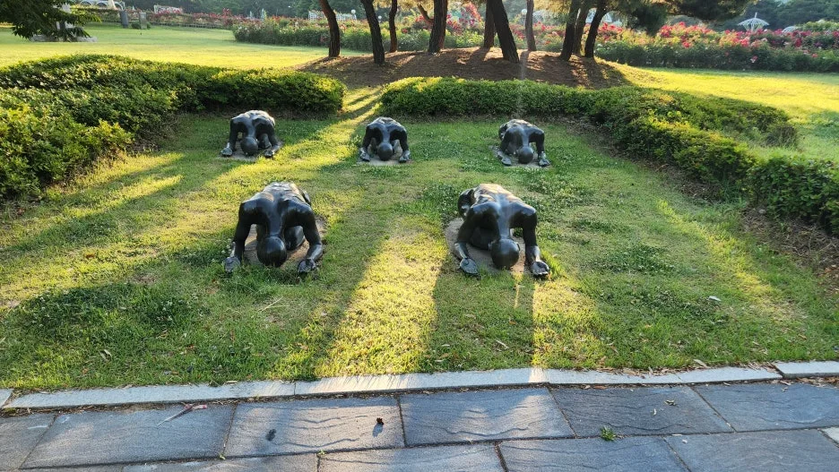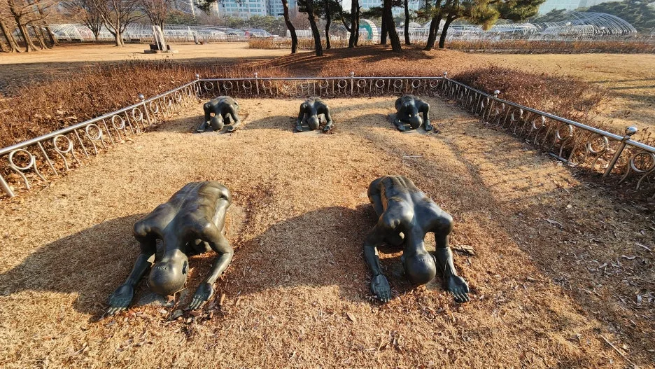 조소, 소조, 조각이라는 용어가 비슷해서 아마 헷갈리실 거예요. 조소는 소조와 조각을 모두 아우르는 뜻입니다. 재료를 붙여 나가며 입체적으로 형상을 표현하는 기법을 소조, 재료를 깎거나 새겨서 입체 형상을 만드는 것을 조각이라고 합니다. 정확히 말하면 위의 작품은 조각이 아닌 소조입니다. 흙으로 만든 뒤 석고로 떠서 틀을 만들고, 녹인 청동을 그 틀에 넣어 만든 작품입니다. 하지만 우리는 '조각 공원'이라고 말하지 '소조 공원'이라는 말은 잘 사용하지 않아요. 정확한 표현은 아니지만 소조와 조각을 구분하지 않고 '조각'이라는 표현으로 통용되고 있는 것 같습니다. 함께 이야기 나눌 수 없음이 아쉽지만, 이 작품을 보고 여러분의 마음속에 물음표가 생겼다면 그것으로 저는 만족합니다.