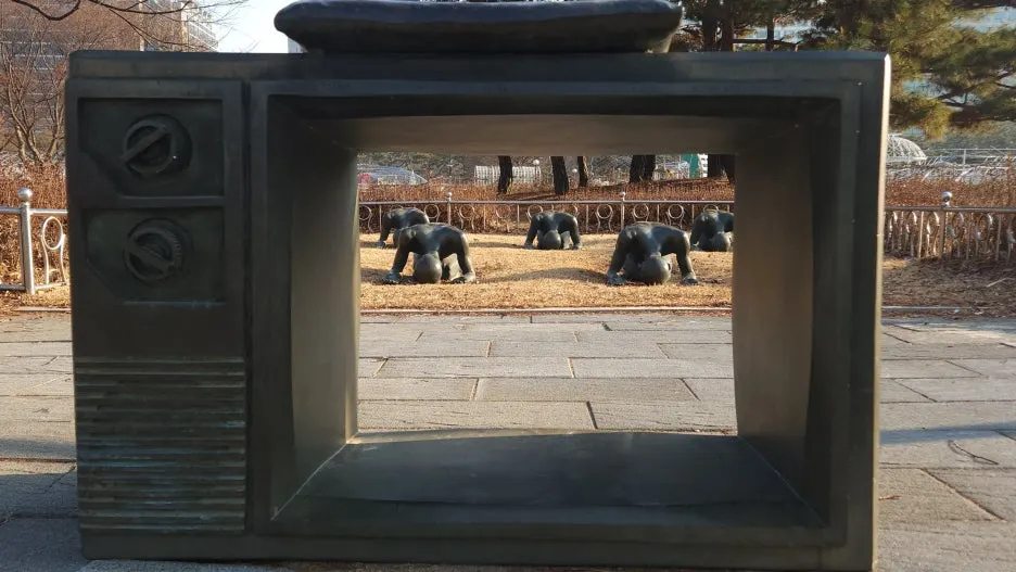 작품 앞에서 몸을 낮춰 TV를 들여다보면 프레임 안에 절을 하는 다섯 명을 만날 수 있고, TV 위에 앉으면 감상자가 사람들에게 절을 받는 느낌이 들어요. 감상하는 위치에 따라 다양한 관점을 제공하는 작품이지요. 전시장이었다면 작품 안쪽으로 들어갈 수 없었겠지만, 우리는 절을 하는 사람 곁에 다가가 뒷모습도 옆모습도 관찰할 수 있어요. 따로 '들어가지 마시오'라는 팻말이 없는 것을 보면 감상자가 작품 안에서 노닐면서 느낄 수 있는 여지를 준 것이 아닌가 해요. TV가 뚱뚱했던 옛날에 우리는 TV를 바보상자라고 불렀었죠. 요건 나이 든 사람만 아는 비밀이에요. 하지만 이제 바보상자라는 말을 쓸 수 없어요. 왜냐하면 너무 얇아졌기 때문이죠. '바보 액자'라고 하면 맞을까요?