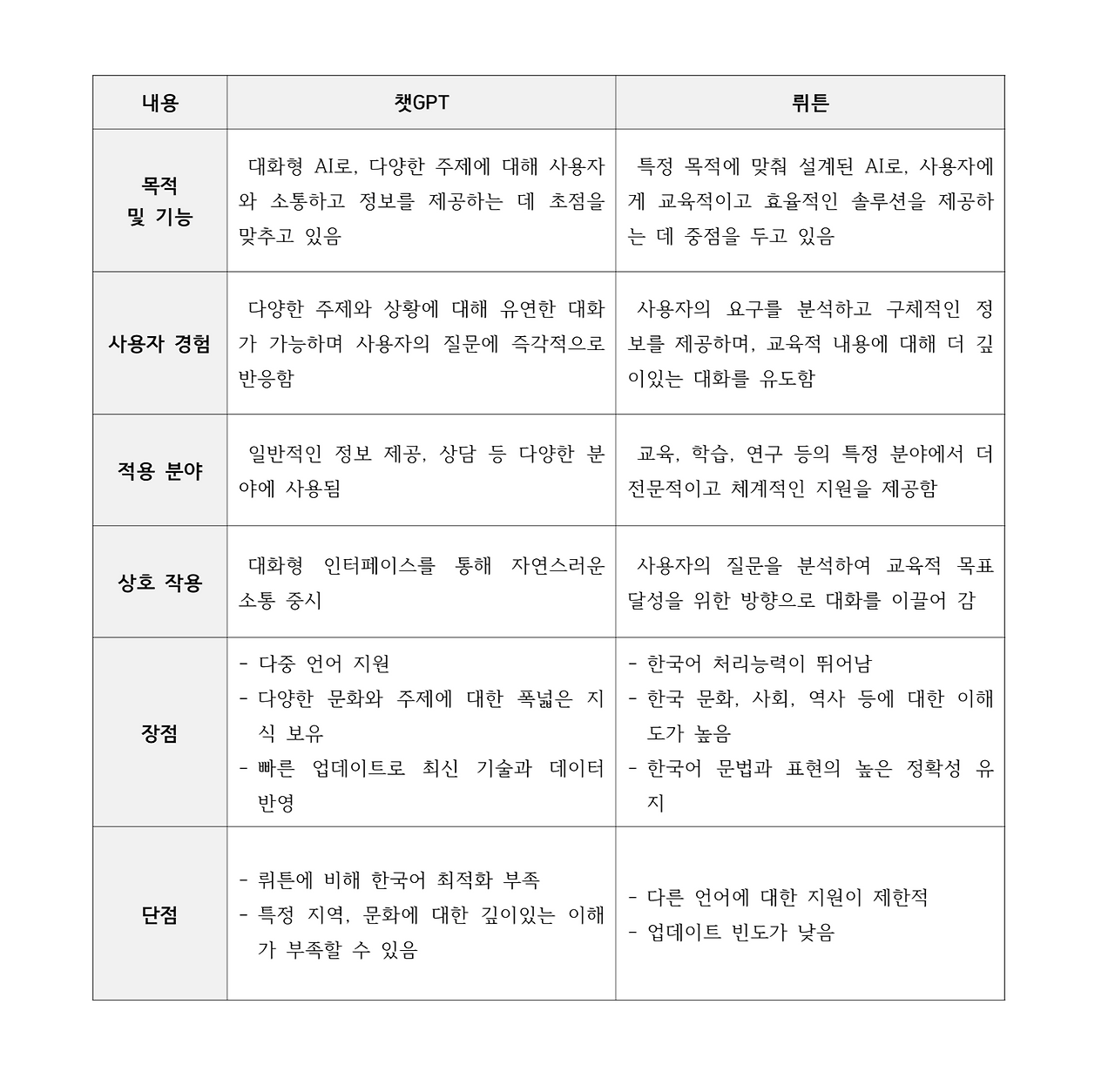 인공지능은 하루가 다르게 발전하고 있다. 인공지능 챗봇의 종류에 따라, 대화를 시도하는 시점에 따라 답변은 달라질 것이다. 챗봇의 기능, 학습능력, 수집한 정보력은 계속 업그레이드 되고 있기 때문이다. 다음은 2024년 8월 기준 챗GPT와 뤼튼을 사용해 본 필자의 개인적 경험과 검색 자료에 근거해 차이점을 비교 분석해 놓은 표이다. 앞으로의 발전 가능성을 염두해 두고 읽기 바란다.