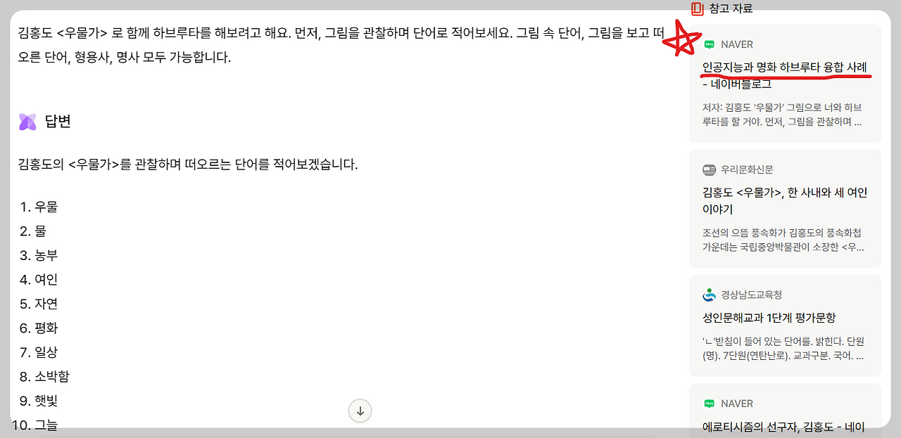 사실 위의 사례는 <인공지능과 명화 하브루타 융합 사례> 라는 제목으로 올해 7월 13일 브런치 매거진과 블로그에 동시에 올린 글을 수정 편집한 것이다. 뤼튼의 업그레이드 상황을 보기 위해 3개월이 지난 지금 똑같은 질문을 다시 했을 때 뤼튼은 내 블로그 글을 참고자료로 소개해주었다. 내가 쓴 글을 인공지능에게 다시 추천받았을 때 느낀 감정은 신기함보다는 책임감과 두려움이었다. 내 글에 오류가 있다면 인공지능이 학습해서 알려주는 내용 또한 오류가 될 수 있다는 사실에 무한 책임감이 느껴졌다. 인공지능이 잘못된 내용을 학습하는 경우 오류 답변이 나올 수 밖에 없으므로 온라인 상에 글을 쓴다는 것은 실로 어마어마한 일이다.
