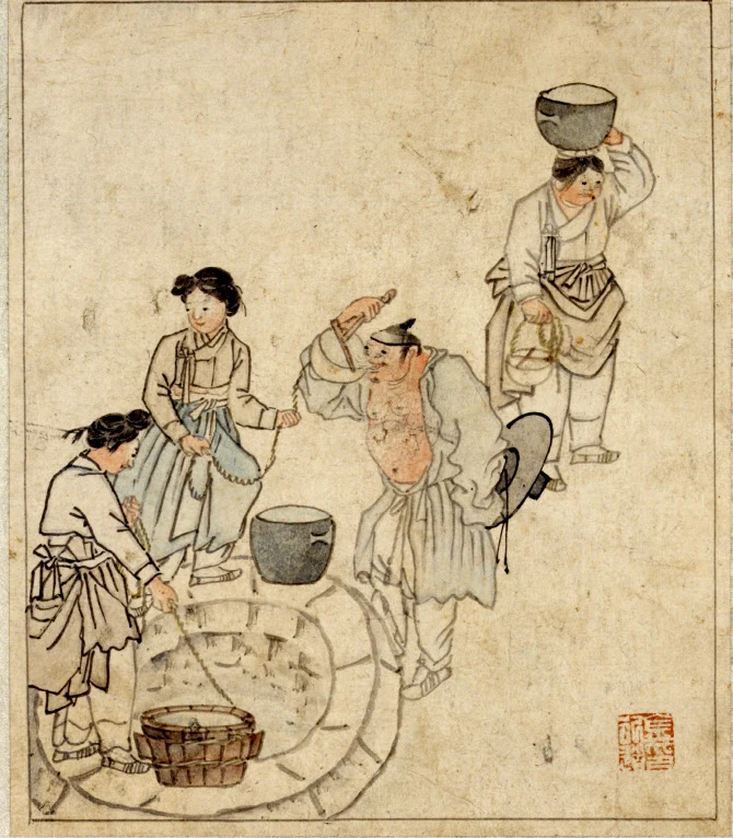 뤼튼 : 우물, 여인, 남자, 물항아리, 철릭, 더위, 일상, 노동, 지친, 편안함, 자연스러움, 대화, 소통, 공동체, 전통, 조선, 생활, 쉬는 시간, 시원함