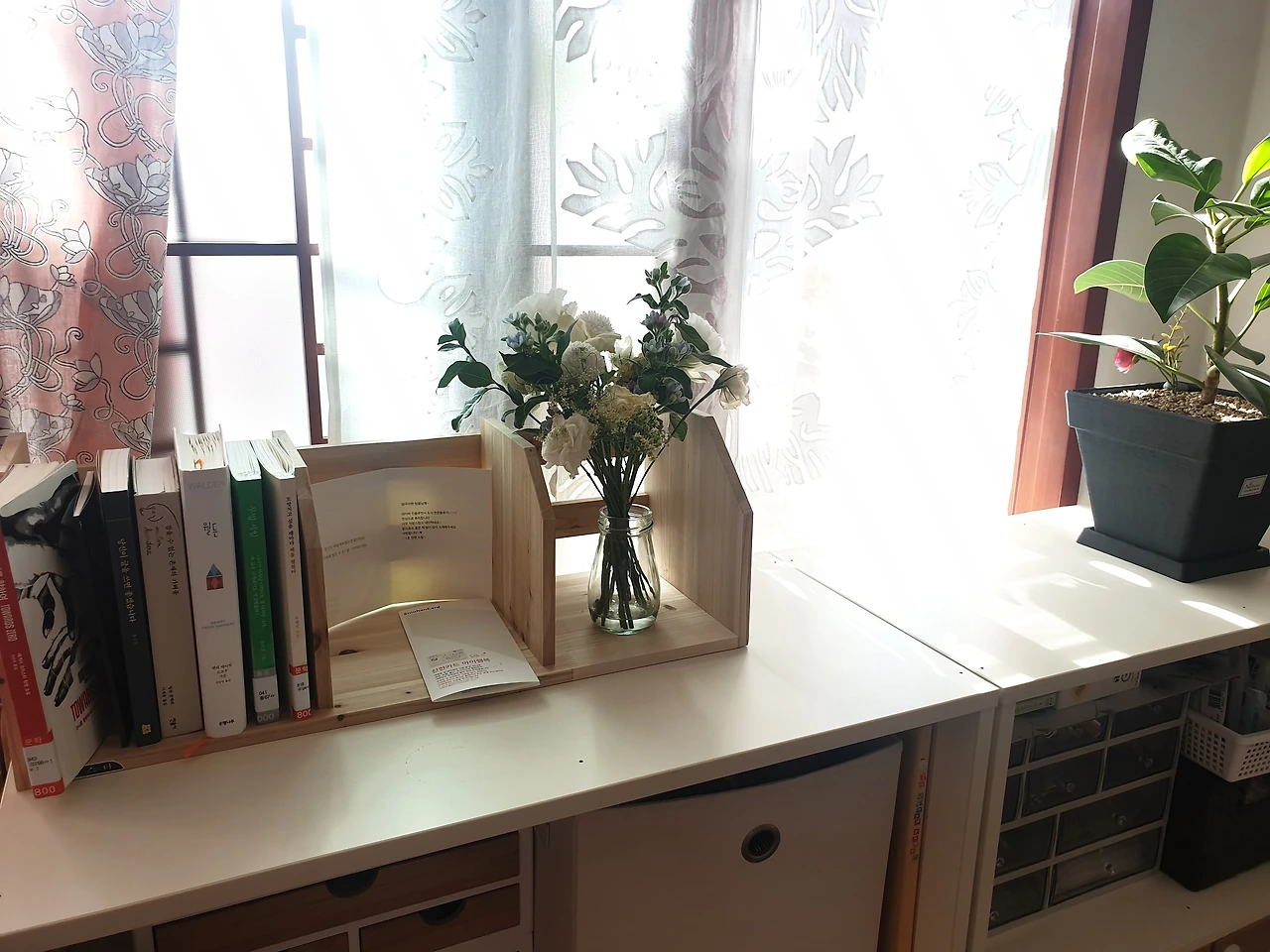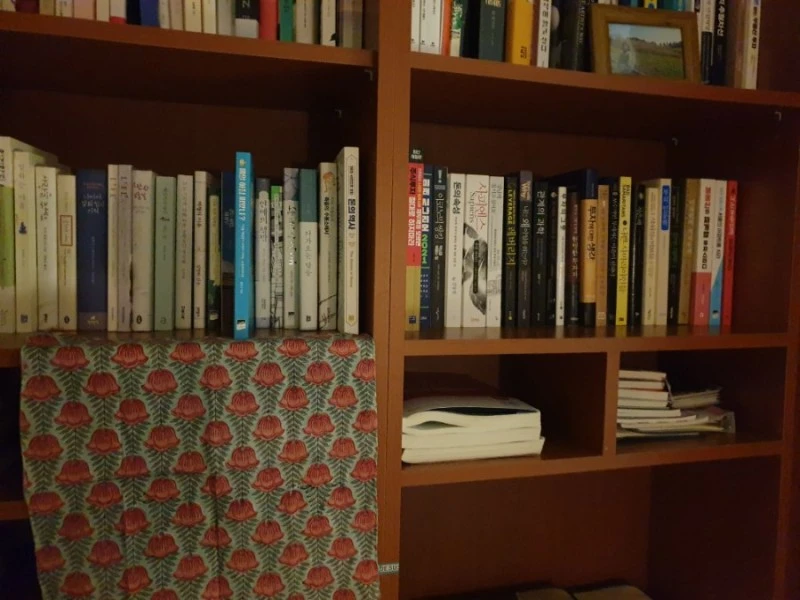 개성 한 두 방울 더 찾기 위해 다시 그곳을 방문했다. 용도를 알 수 없었지만 후배 말대로 어디든 툭툭 걸치려고 큰 정사각형 사이즈의 패브릭을 사 왔다. 책장 지저분한 곳을 가려야지 하며 여기저기 가려보았는데 당최 마음에 들지 않았다. 테이블 덮개로 해볼까 싶어 또 여기저기 깔아봤다.
