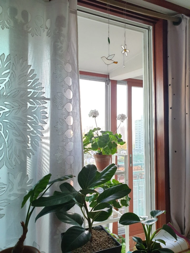 집에 돌아와 원래 커튼을 치우고 하얀 레이스에 잎이 넓적하고 큰 나무가 있는 커튼을 걸었다. 3월이었는데 여름이 성큼 다가온 느낌이었다. 지금 걸어도 되나? 잠깐 멈칫했다. 사진을 찍어 후배에게 보냈다. 후배의 코치를 받아 다양하게 커튼 위치를 바꾸며 밤늦은 시간까지 조금 행복했다. 연꽃무늬 살구색 커튼은 아직 내 방에서 소화하긴 어렵다는 생각이 들긴 했지만 내가 원하는 개성 한 방울이 섞인 듯싶어 만족스러웠다. 늘 이렇게 경계에 있는 것. 보통의 무리에 있고 싶으면서도 가끔 튀고 싶은 마음이 내 취향이다. 이런 것도 취향이라고 할 수 있는지 모르겠지만 무난하고 평범한데 특별한 무엇이고 싶다. 주변과 조화를 이루는데 돋보여서 쳐다보게 되는, 그런 사람이 되고 싶다.