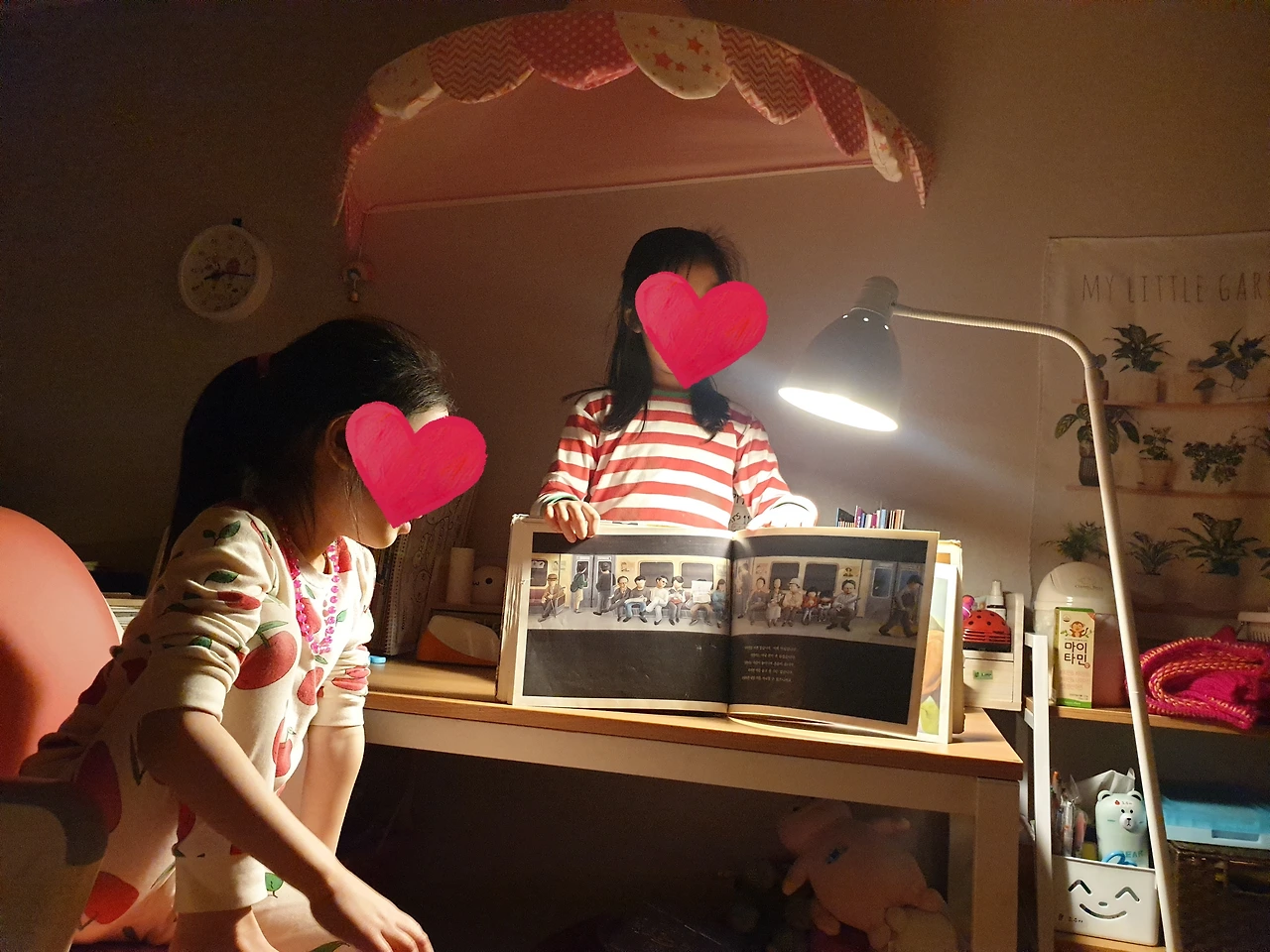 조금 일찍 일어난 날은 출근 준비를 마치고 글을 썼다. 아이들은 바쁜 아침에 글을 쓰고 있는 내 모습이 신기한지 자신들도 더 자지 않고 글 쓰는 나를 지켜봤다. 내가 책을 읽으면 아이들도 같이 책을 봤다. 부모가 책을 보면 아이도 따라서 본다던데? 하는 말은 반은 맞고 반은 틀리다. 목적이 있는 행동은 오래가기 어렵고 무엇이든 부모가 정말 즐기는 모습을 보이면 아이도 즐기고 싶은 무언가를 찾는다. 물론 그게 책이 아닐 수도 있고. 2학년인 첫째는 벌써 독서 모임 멤버를 모집했는데 책을 읽는 것에서 그치는 게 아니라 함께 모여 생각을 나누며 활기 넘치는 엄마의 모임에 매력을 느꼈던 것 같다. 아이들과도 가끔 미니 독서모임을 했는데 어른과 함께 생각을 나눈 경험이 그럴싸하게 느껴졌을 수도 있고. 어쨌든 책 자체보다 이야기를 나누는 모임을 좋아하는 것은 분명하다.