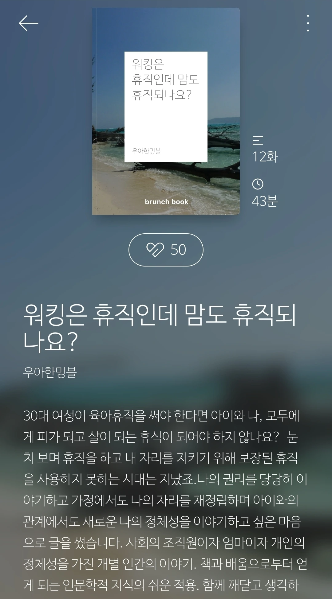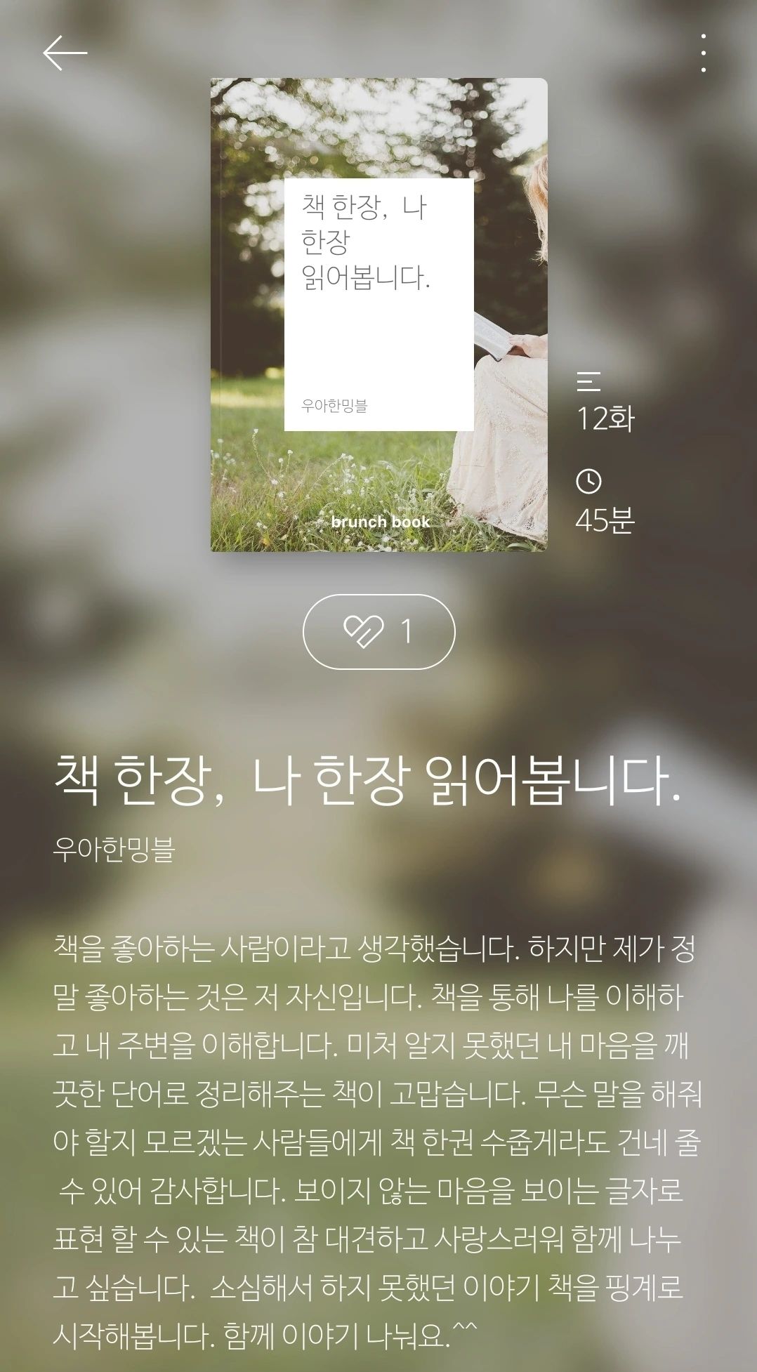 그리고 이 글을 쓰기 위해 내 브런치 북을 찾아봤다. 분명 나는 아무 글이나 썼는데 내가 쓴 글의 주제는 두 가지였다.(물론 삭제한 브런치 북은 포함하지 않았다^^;;)일하는 엄마, 내가 읽은 책. 일하는 엄마가 읽은 책이며 책을 읽으며 일하는 나에 대한 글이었다. 그리고 이번에 엮은 브런치 북이 “균형 있는 일상을 위해 출근합니다.”였다. 여기에는 내가 출퇴근하며 읽은 책을 바탕으로 워킹맘으로 균형을 잡기 위한 나의 노력이 담겨있다. 꼭 워킹맘이 키워드가 된 것은 아니지만 지극히 소심하고 평범한 여성이 직장에서 얻을 수 있는 것들을 다뤘다. 마냥 싫지도 그렇다고 천국도 아닌 직장생활. 하지만 내 삶의 균형을 이뤄주는 여러 가지 것들에 대하여. 아! 이것이 내가 할 수 있는 이야기였구나. 그동안 나는 무슨 글을 쓸 수 있는지, 내가 써야 하는 글이 어떤 건지 몰라 헤맸었다. 그냥 내 삶에서 일어나는 모든 일들에 대하여하고 싶은 말이 있을 때마다 무작정 쏟아냈다. 바보 같고 무식한 방법이지만 그렇게 100여 개의 글을 발행하고 나서야 알게 됐다. 내 이야기가 이것이었다는 걸.