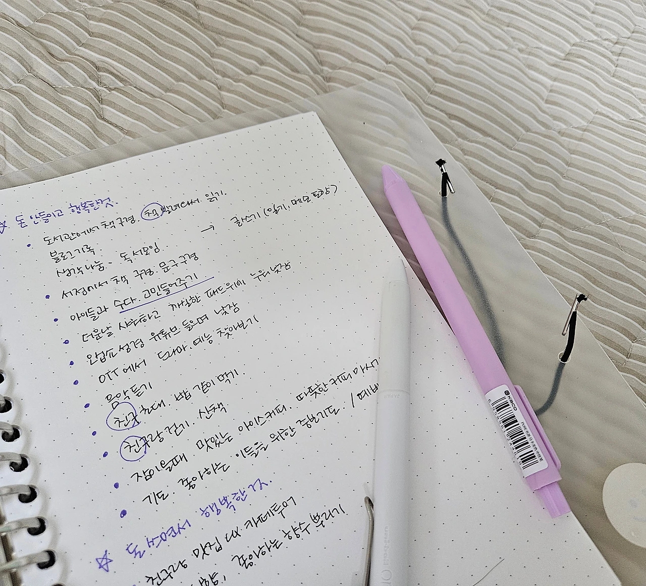 위와 같은 최소한의 용돈이 필요한 것은 맞지만 그렇다고 행복의 충분조건은 아니다. 그리고 '돈'만이 나를 행복하게 하는 것도 아니다. 나는 실제로 혼자서도 시간을 잘 보내고 집에만 있어도 즐겁게 지낼 수 있는 사람이기도 하다. 그래서 오늘은 나의 행복리스트를 적어보았다. 돈이 필요한 행복과 돈 안 들이고도 행복할 수 있는 것을 나누어서.
