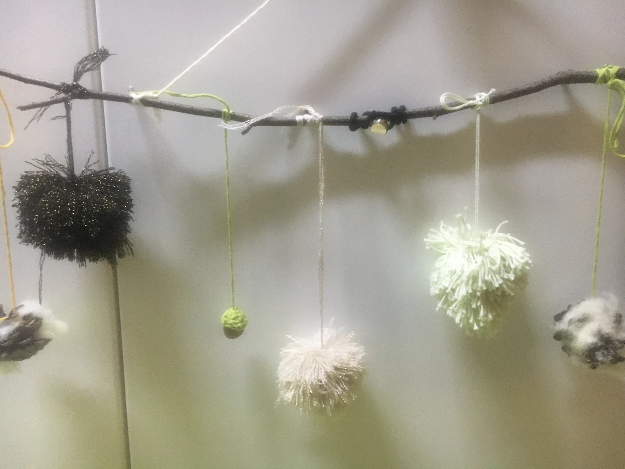 산에서 주워온 나뭇가지에 집에 있던 폼폼이와 솔방울을 달아 크리스마스 장식을 만들었다.
