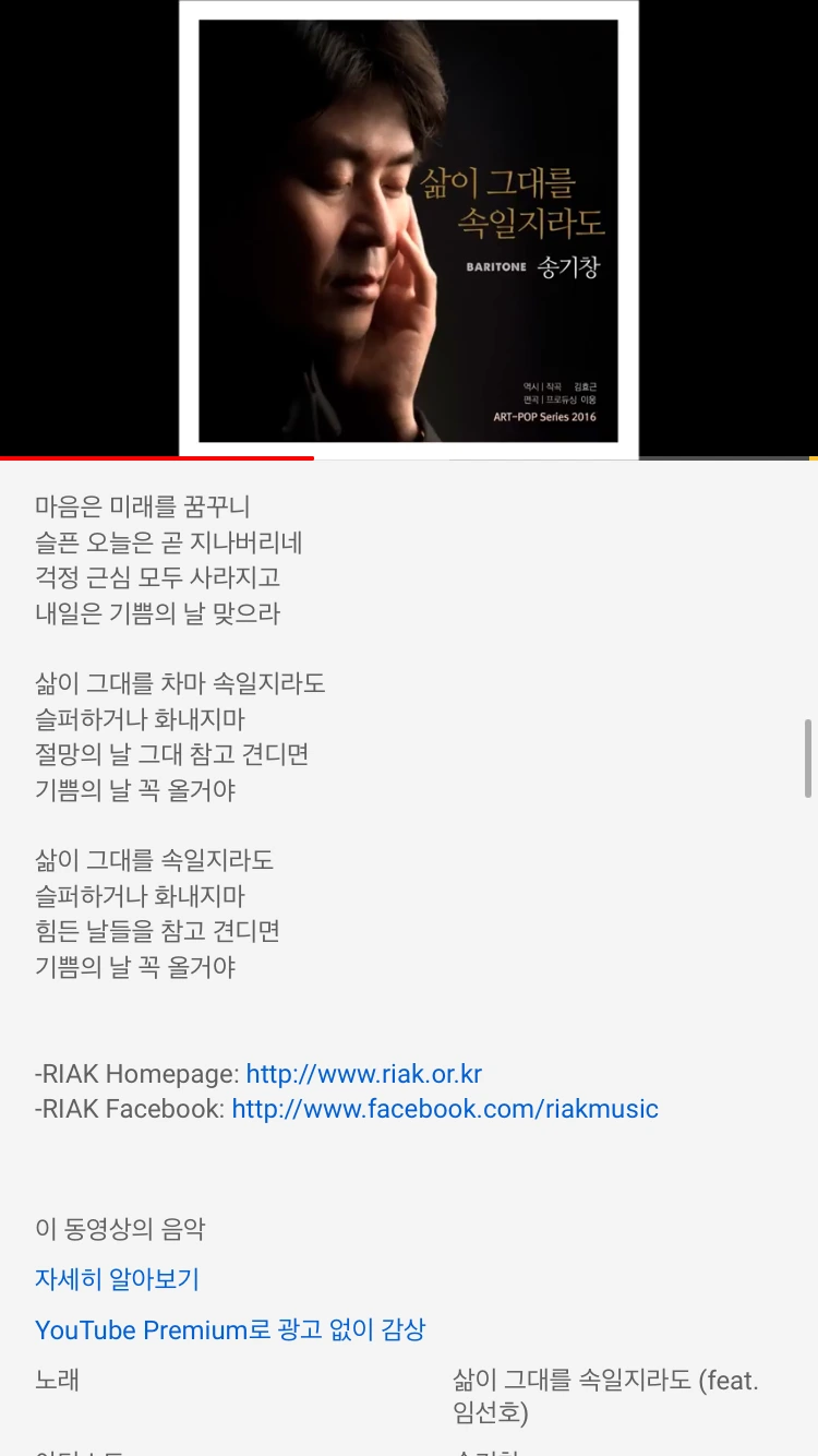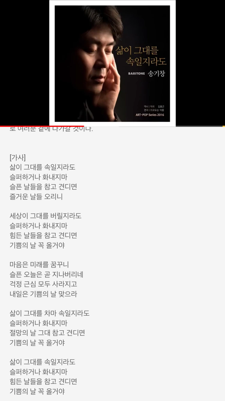세월호 추모곡으로 알려진 "내 영혼 바람 되어"를 부른 바리톤 송기창 님의 곡이다. 푸시킨의 명시 "삶이 그대를 속일지라도"를 번안해 작곡가 김효근 님이 곡을 썼다고 한다.