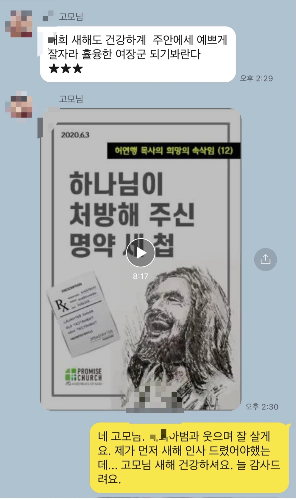 이젠 연세가 있으셔서 전화 통화를 못하시고 카톡을 보내시는데, 언제나 시작은 아이에 관한 이야기이고 내용은 내 병에 관한 성경적 조언들이다. 주로 기도를 열심히 하고 마음을 편히 먹으면 병을 이기는 데 도움이 된다는 내용들인데, 여든 가까이 되신 분의 마음이라 따지지 않고 그러려니 감사하다 답장을 드린다. 우리 엄마도 아니고, 이 악물고 따질 이유도 없고 말이다.