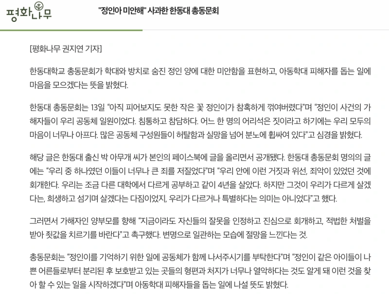 그 사건이 발생한 직후, 그러니까 정인이라는 한 어린이가 그렇게 사망한 직후 아주 잠깐 언론의 주목을 받은 때가 있었다. 한0대 졸업생인 친구들의 말에 따르면 이미 그때 동문들은 알고 있었다고 했다. 다들 충격 속에서 어떻게 해야 할지 몰라 힘들어했다는 말도 함께 들었다.