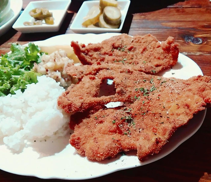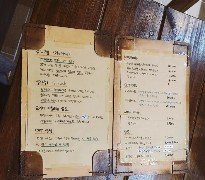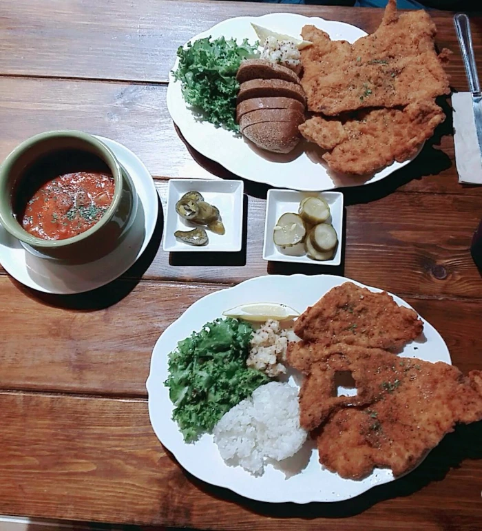 우리는 30,000원 짜리 2인세트를 시켰다. 돼지고기 슈니첼 2개와 굴라쉬. 사이드 선택은 남편은 빵, 나는 밥.