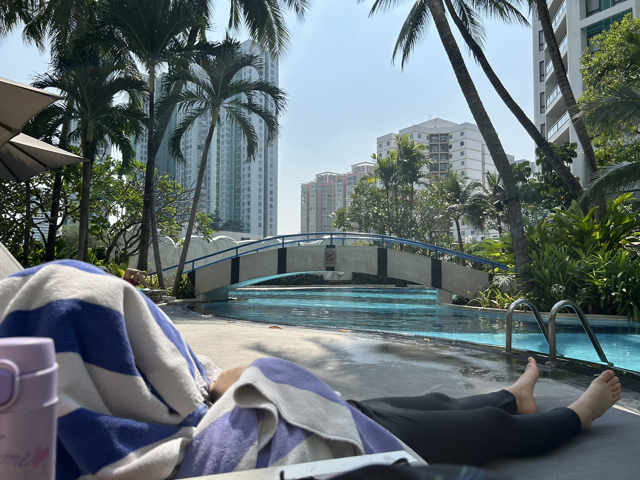 3시 아이 그림 수업을 예약해 두고, 밥을 30분 뒤에 되도록 (존재만으로도 기특한) 1인용 쿠쿠밥솥에 눌러두고, 수영장에 누웠습니다. 1시에 온다는 집기 체크 직원은 왜 안 나타나시는지, 마트 가는 셔틀은 예약해야 하는 건 아닌지... 매 순간 시간과 효율을 따집니다.