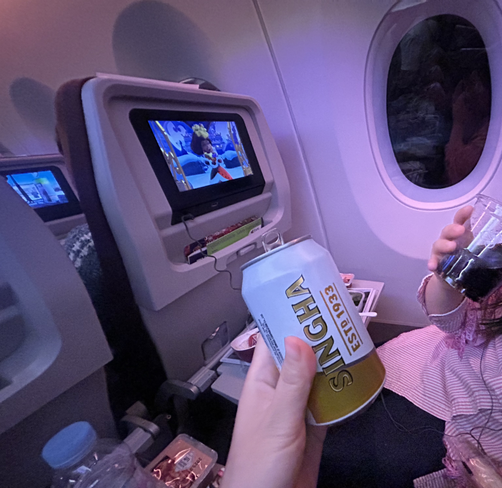 비행기 안은 아이가 떠들어도, 어른이 보는 영상 소리가 새어 나오는 게 아니라 아예 이어폰을 안 켜도 크게 개의치 않았습니다. 승무원의 친절한 목소리는 들리지 않았는데도 준비한 간식을 나눠주고, 안전벨트를 점검했습니다. 미리 태국 맥주 한 잔을 따르며 크게 눈에 거슬리지도, 거슬려하지도 않은 이미 태국 같은 분위기를 느꼈습니다.