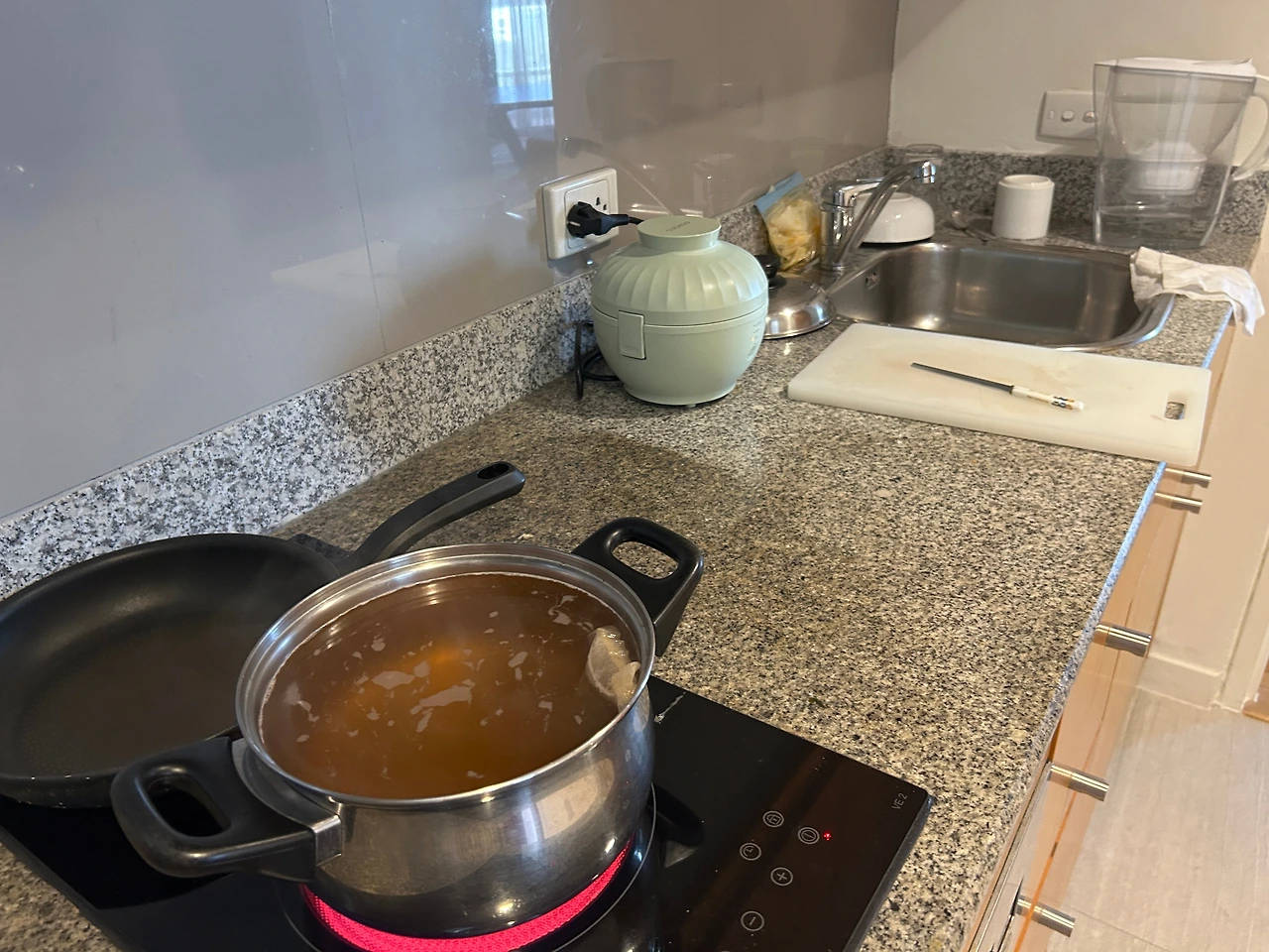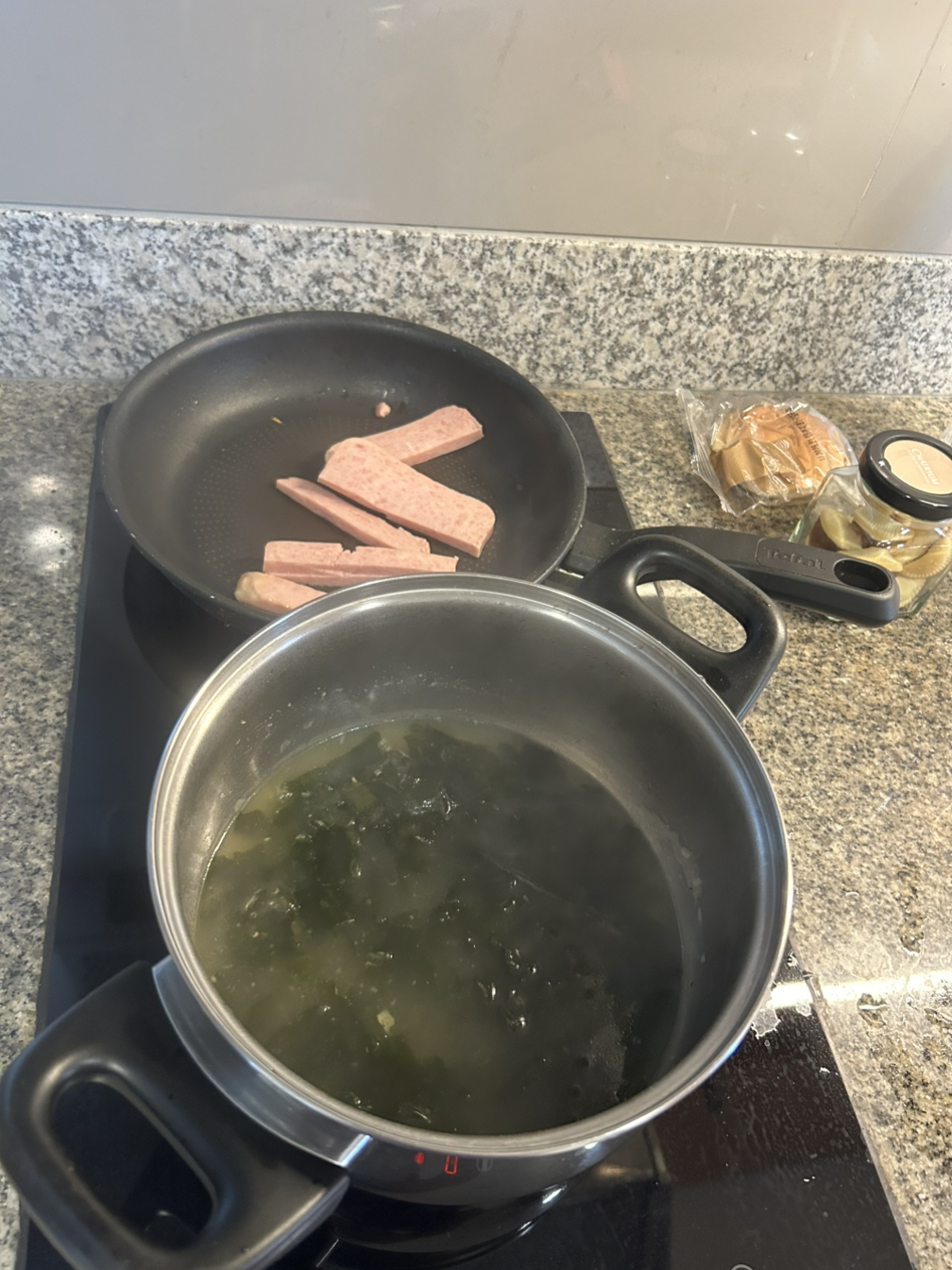 한국에서도 바빠 못한 보리차물도 끓이고 큐브 미역굿, 1인용 밥솥으로 금방 지은 밥 먹기, 브리타 정수기로 한 번 더 물 걸러 양치도 하고 그릇도 씻습니다. 참 살뜰합니다.