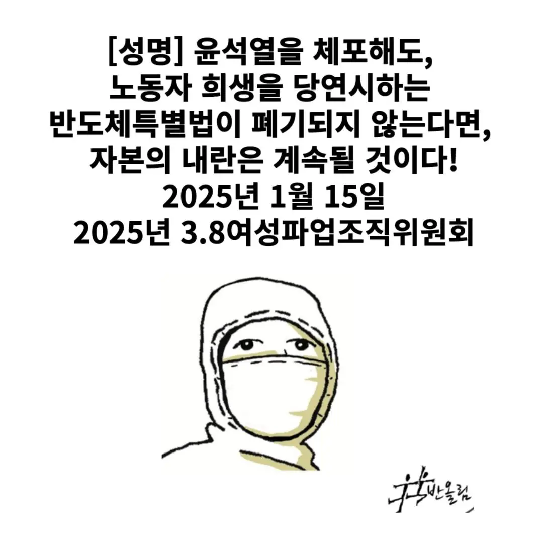 반도체 산업이 희생시켜 온 노동권, 반도체 산업의 경제적 효과의 허구성, 반도체산업의 이윤을 위해 빚은 사회생태적 부정의를 우리는 더 이상 두고 볼 수 없다. 반도체 산업이 아니라 노동자의 권리에 우리의 미래가 달려있다. 우리는 윤석열뿐 아니라 그가 비호해 온 가부장적 자본주의 체제에도 반대한다. 내란과 내란동조는 정치에만 있지 않다. 윤석열을 체포해도, 노동자의 희생을 당연시하는 반도체특별법이 폐기되지 않는다면, 자본의 내란은 계속될 것이다.