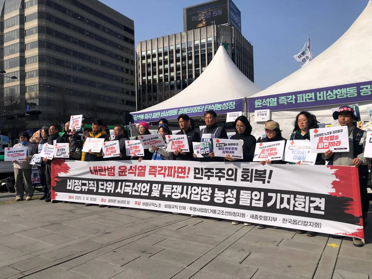 윤석열은 파면되고, 내란동조, 자본의 하수인 김문수 노동부 장관은 당장 사퇴해야 합니다. 헌법재판소는 즉각 윤석열을 파면하십시오! 재벌을 위한, 반노동 정책! 사회 곳곳의 내란을 끝내야 합니다. 윤석열을 파면하고, 우리의 노동권을 지키고, 안전하고 차별 없는 일터를 만드는 봄을 기다립니다! 윤석열을 파면하고 내란동조, 근로기준법을 무력화한 김문수 장관도 물러나도록 합시다. 우리의 쉼과 여유, 일상이 있는 우리의 봄! 맞이합시다!