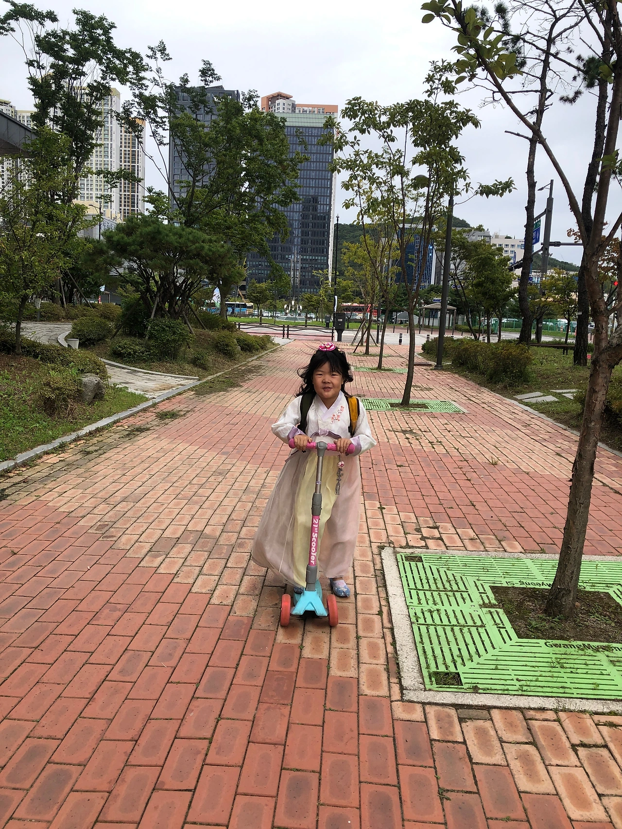 6시에나 도착한 집에서 한바탕 신경이 곤두섰다 잠에 들었다. 12시간 넘게 꼬박 자고도 피곤한 아침, 유치원에선 추석 맞이로 한복 입고 등원하라고 한다. 오늘따라 자동차가 없는데 택시보단 버스가 좋다는 아이의 성화에 버스를 기다렸다. 한 번에 가는 버스가 없기에 버스를 갈아타는데 아이가 내린다고 배려할 리 없다. 흔들리는 차량에서 킥보드와 가방 두 개와 아이까지, 버스카드까지 내밀고, 계단을 오르며 무사히 유치원에 도착하기만을 바랄 뿐이다. 고군분투했지만, 지각이었고 또다시 미안하다고 연신 고개를 숙였다. 킥보드를 끌고 사무실 가는 지하철로 향하는 오전 9:30 나는 이미 지쳤다.