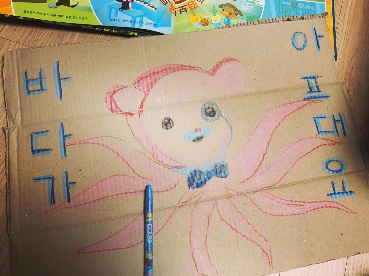 923 기후정의행진 전날 아이와 함께 피켓을 만들었다. 아이가 좋아하는 옥토넛 동화책에서 잉클링교수님(문어), 페이소(펭귄)을 밑그림으로 그리고 "바다가 아프대요" "페이소를 지켜요" 글씨를 썼다. 아이가 그 위에다 색칠했다. 출장 준비, 집 청소, 아이 밥 먹이기 사이에 정신없이 진행된 일이다.