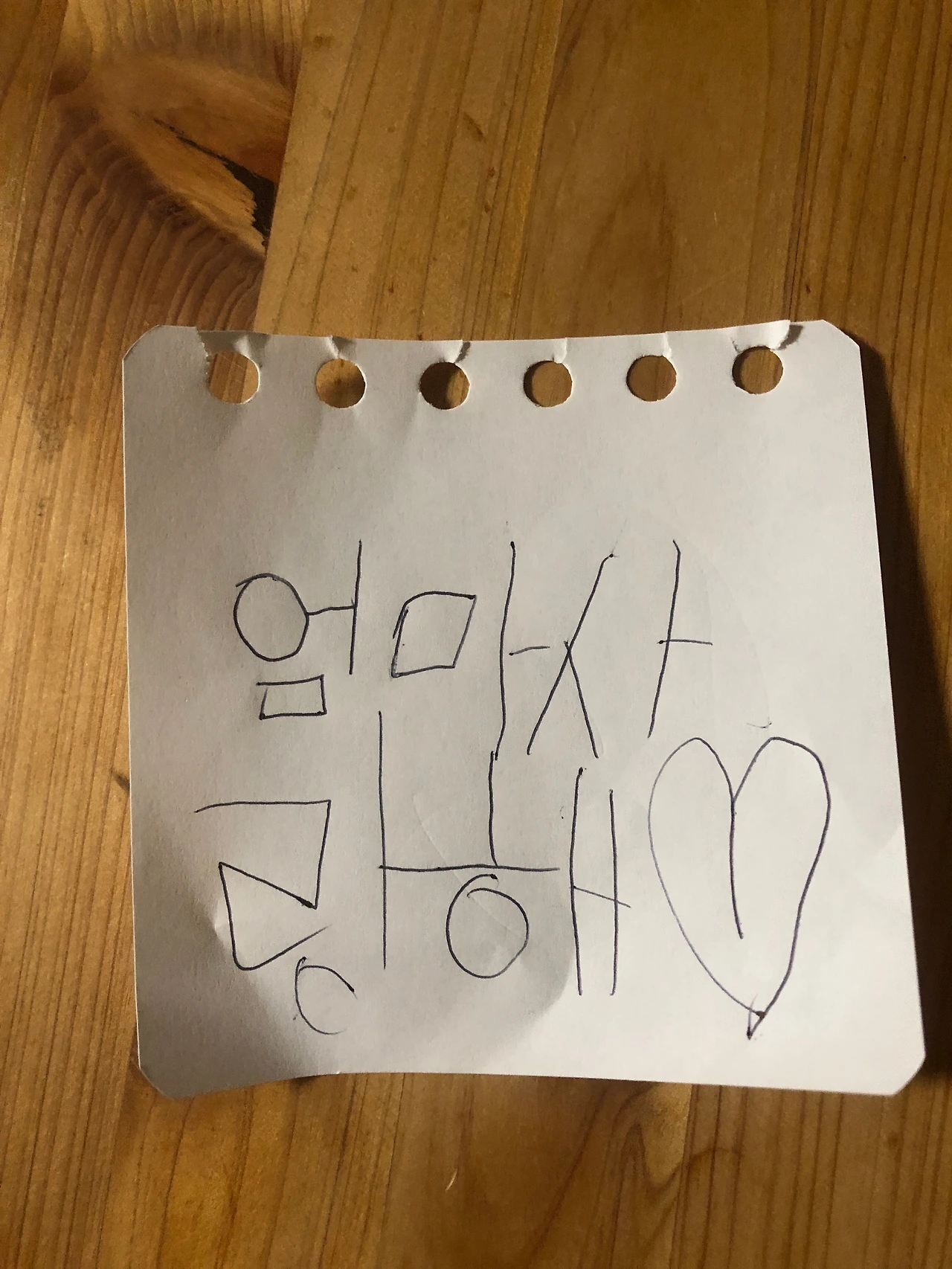 엄마에게 외면받고 섭섭했을 아이는 오늘 일어나자마자 방에 와 내 옆에 누웠다. '어제 엄마가 화내서 아빠랑 잤는데 좀 힘들었어' 라며 '엄마 마음이 풀렸을 때 주려했어'라고 "엄마 사랑해" 하트가 그려진 편지를 주는 아이. 꼭 안고 미안하다 사과했다.