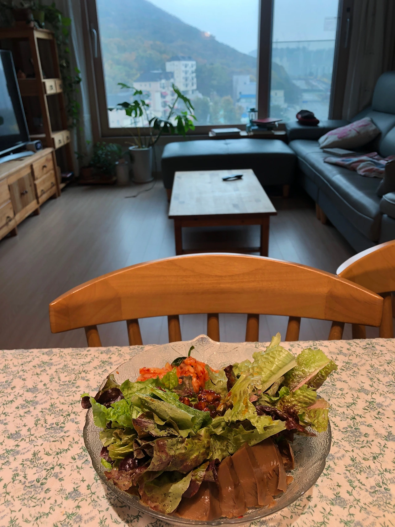 묵 양념장에 참기름, 텃밭에서 따온 상추, 오징어무생채로 마무리!
