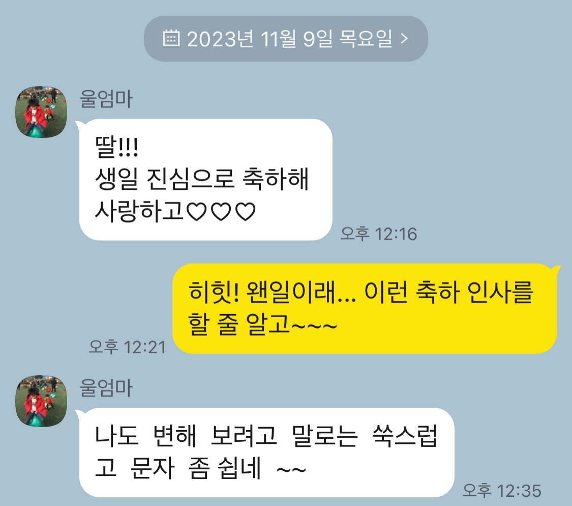 엄마가 보낸 게 맞나 싶은 문자에 화들짝 놀라고 만다. 할 수 있었네! 44년 만에 새로운 엄마를 만난 느낌. 엄마에겐 평생 걸린 변화겠다.