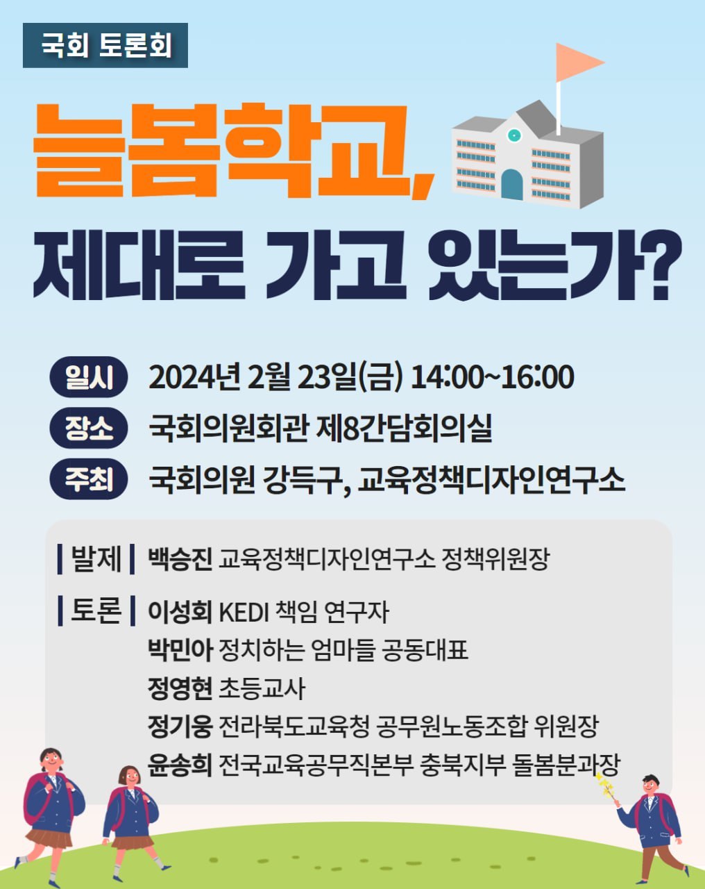 이에 정책의 대상자이지만, 늘봄학교를 다양한 교육 주체자의 논쟁을 볼 때 정책이 어떻게 만들어지고, 집행되는지의 관심으로 국회의원 강득구, 교육정책디자인연구소가 주최한 “늘봄학교, 제대로 가고 있는가?” 토론회에 참여하였습니다. 의원님은 이번 일정을 의정 활동으로 참여 못하셨다는데, 영상으로 꼭 확인하셨으면 합니다.